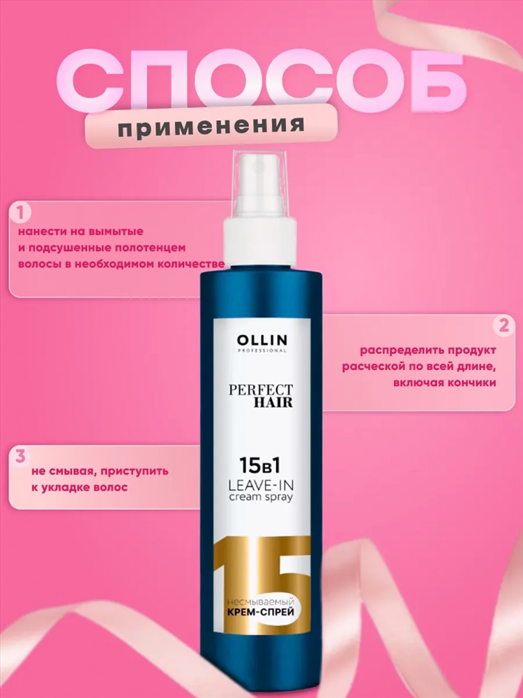 Скидка: любая | от 10% и больше Подарите волосам профессиональный уход! Спрей - термозащита для волос гарантирует вашим локонам блестящий вид и здоровье. Этот замечательный косметический продукт создан для женщин, которые ценят красоту и заботятся о своих прическах. Несмываемый спрей эффективно защищает волосы при укладке утюжком или феном, предотвращая повреждения от высоких температур. Он идеально подходит для всех типов волос, включая окрашенные. Этот инновационный спрей объединяет 15 функций в одном средстве, придавая вашей прическе объем и гладкость. Благодаря кератину и увлажняющим компонентам волосы становятся шелковистыми и легкими в расчесывании. Вам не придется подбирать расчески, ведь волосы будут как шелк. Гели, маски и другие наборы для волос не нужны с несмываемым уходом от Оллин. Особенная формула защищает секущиеся кончики, сохраняя идеальную структуру волос. Спрей также обеспечивает защиту корней и разглаживание по всей длине. Косметика легко наносится дозатором, создавая аккуратное покрытие. В результате ваши локоны приобретают роскошный блеск и здоровый вид. Волосы после применения средства не пушатся даже в условиях повышенной влажности или ветра.