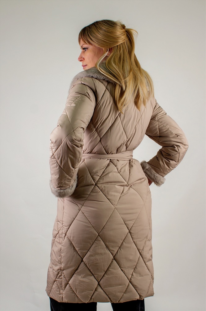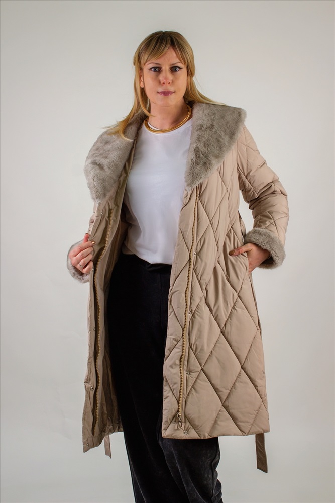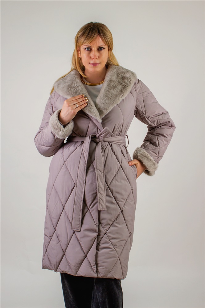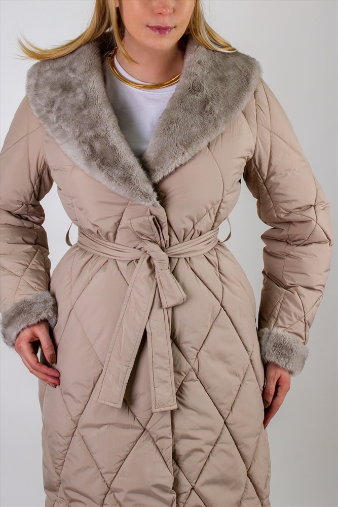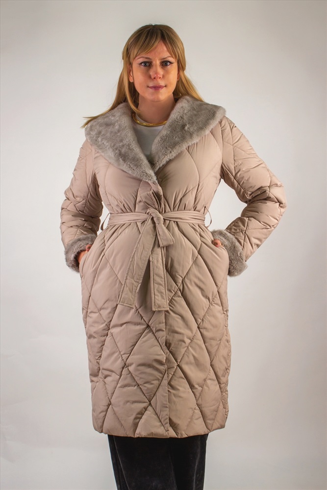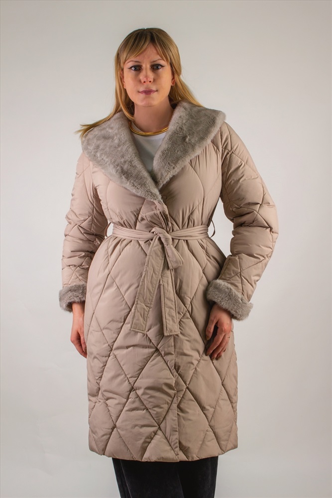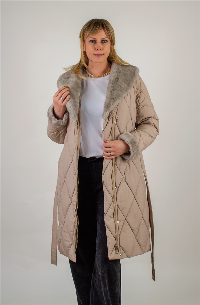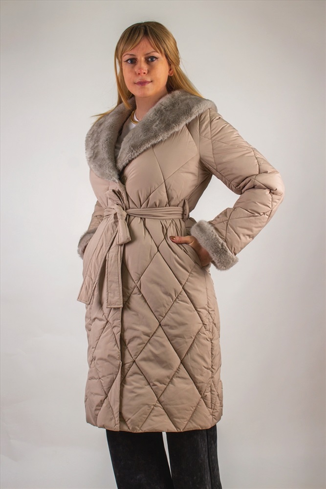 Состав: 100% п/э Модель: Стеганое пальто с меховой отделкой арт. 23153 Тип товара: пальто Материал: наполнитель холлофайбер | курточная стеганая | курточная стеганая | наполнитель холлофайбер Бренд: Styie Evolution Длина: длинный Карман: прорезные Отделка: с карманами | с манжетами | с мехом | с поясом Рисунок: однотонные Рукав: длинный рукав Сезонность: осень | весна | зима Силуэт: свободный Скидка: любая | от 10% и больше Стиль: повседневный Воротник: отложной воротник | воротник шалька Застежка: молния | пояс Стеганое пальто с меховой отделкой арт. 23153, евро-зима, демисезон. это сочетание утончённого городского стиля и продуманной функциональности. Модель с утеплителем оптимальной плотности, что позволяет комфортно чувствовать себя при температурах до 10С . Демисезонная адаптивность делает пальто универсальным решением для межсезонья, когда погода переменчива. Верх выполнен из износостойкого полиэстера с водоотталкивающей пропиткой, сохраняющей лёгкость и не дающей влаге скапливаться на поверхности. Диагональная стёжка ромбом равномерно распределяет наполнитель, предотвращая холодные зоны и деформацию изделия после стирок. Модель легко стирается в деликатном режиме, не теряя формы и цвета. Отложной воротник и отделка манжет декорированы искусственным мехом серого оттенка под норку, придающим акцент и уютный объём у лица и на рукавах. Такой приём не просто украшает изделие, но и защищает от ветра и холода. Трикотажные рукава на манжетах обеспечивают свободу движений и создают дополнительный тепловой барьер. Пальто застёгивается на двухзамковую молнию с защитной планкой на кнопках конструкция надёжна, удобна в эксплуатации и защищает от продувания. Акцентным дополнением служит съёмный пояс в тон, подчёркивающий линию талии и создающий изящный силуэт песочные часы. По бокам расположены два скрытых кармана-листочки с застёжками-кнопками, чтобы ценные мелочи и смартфон всегда были под рукой. Бежевый оттенок фасона универсален: он гармонирует с яркими и нейтральными образами, легко комбинируется с шарфами, шапками и обувью любого стиля. Это пальто станет вашим верным спутником в городе и на загородных прогулках, обеспечивая комфорт и безупречный внешний вид. Арт. 23153 выбор современных женщин, ценящих качество, тепло и элегантность в каждой детали. Таблица размеров и веса