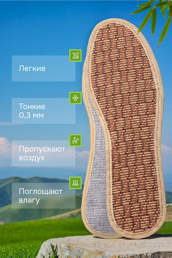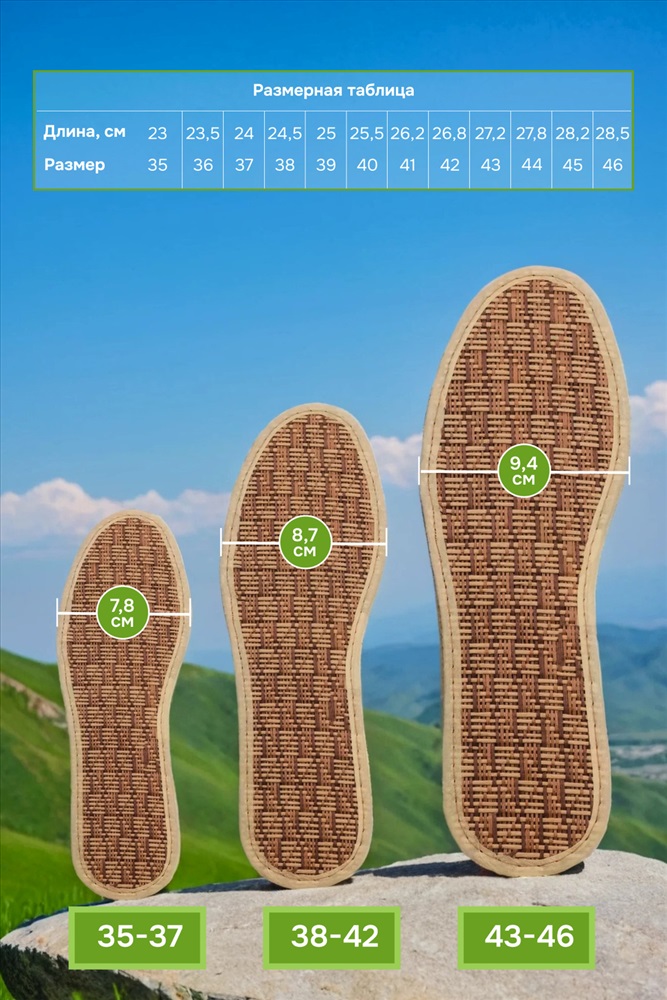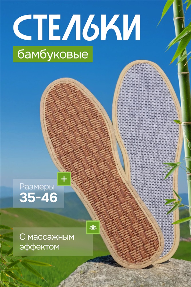 Сезонность: лето | осень | весна | зима В комплекте одна пара, выбранного Вами размера. Стельки Бамбук толщиной 0.3-0.5 см., могут использоваться в любых типах обуви. Стельки отлично поглощают влагу и хорошо пропускают воздух. Не утепленные. С обратной стороны текстиль. Материал, из которого сделаны стельки, обеспечит Вашим ногам комфортность. Рельеф стельки во время ходьбы дает массажный эффект и улучшает кровообращение, избавляет от усталости ног.