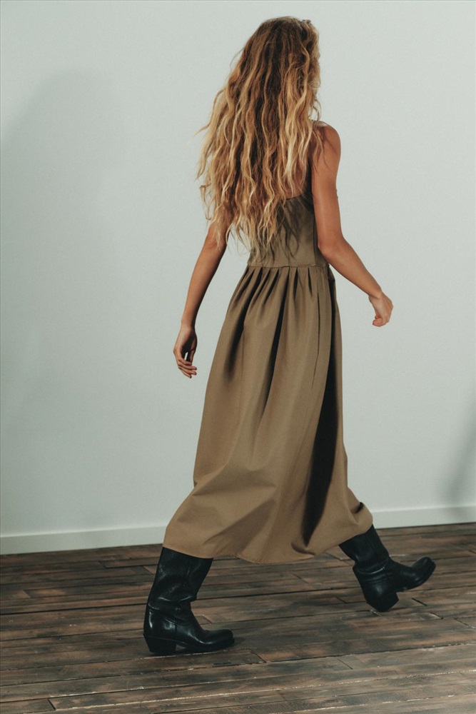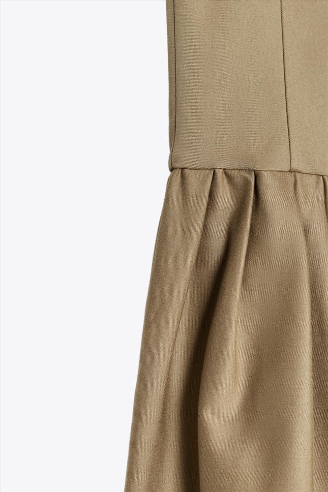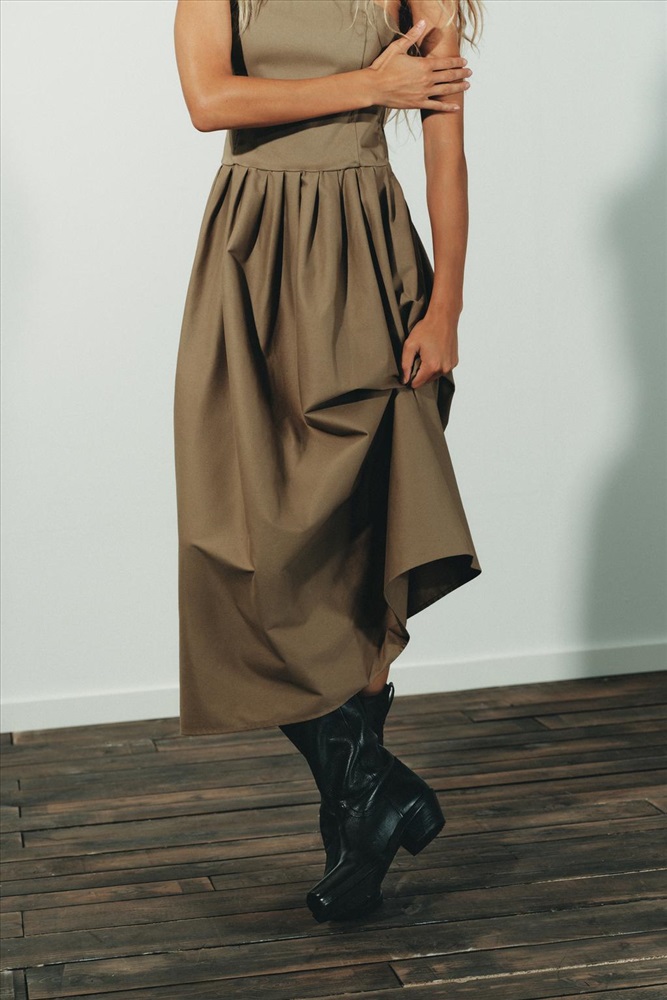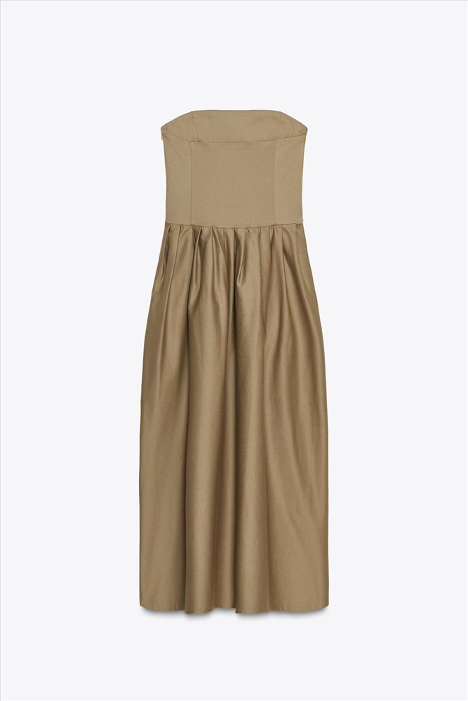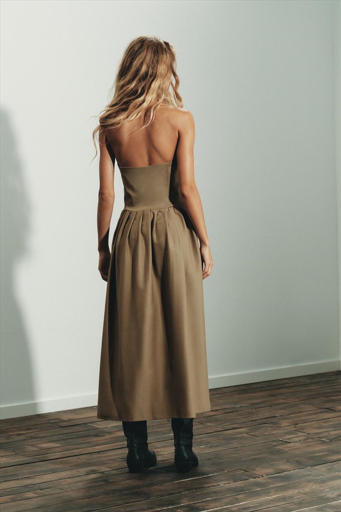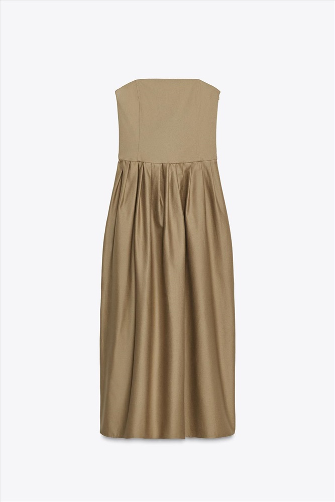 Midi dress with a straight neckline and open shoulders. Pleated detail. Side zip fastening concealed in the seam. COMPOSITION, CARE & ORIGIN COMPOSITION OUTER SHELL 97% cotton LINING 97% cotton Which contains at least: OUTER SHELL 97% OCS certified organically grown cotton LINING 97% OCS certified organically grown cotton CERTIFIED MATERIALS OCS CERTIFIED ORGANICALLY GROWN COTTON This fibre is produced using no artificial fertilisers or pesticides and is grown from seeds that have not been genetically modified. We are currently working with the Organic Content Standard (OCS) that monitors the process from the source to the end product. Certified by Intertek 193341 More information CARE Caring for your garments to extend their useful life. Lower temperature washes and delicate spin cycles are gentler on garments and help to protect the colour, shape and structure of the fabric.