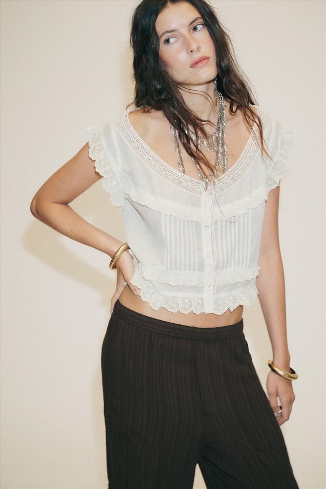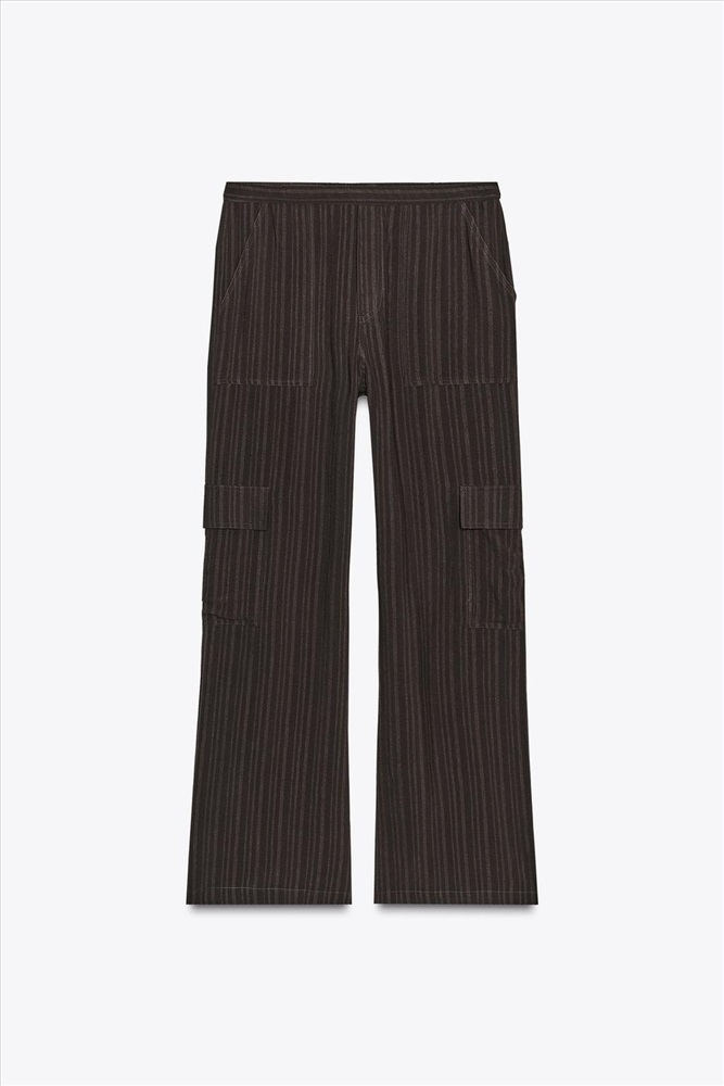 Trousers made of flowing fabric. Mid-rise with an elasticated waist. Patch pockets on the front and back and a flap on the leg.