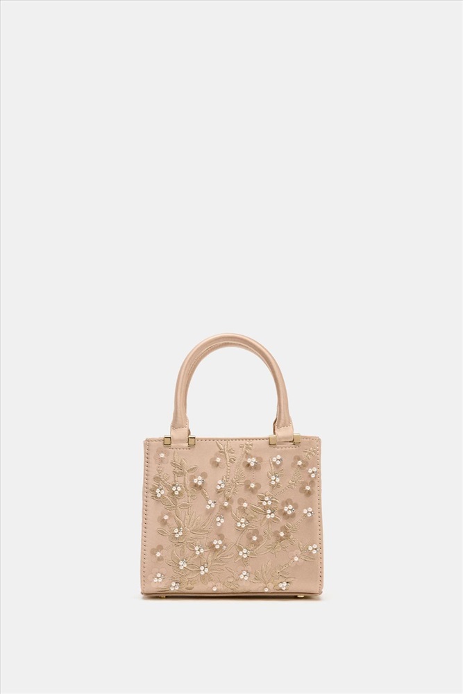 Structured fabric handbag. Embroidered details on the top with faux pearls. Two top handles and a removable crossbody strap with metal rings. Interior pocket. Metal fastening.