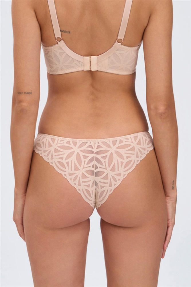 Трусики бразильяна из коллекции SugarDune выполнены из роскошного кружева с геометрическим узором. Ластовица проложена 100% хлопком телесного цвета. Натуральная палитра делает бельё практически невидимым на коже, а плоское плетение кружева гарантирует его незаметность под одеждой, геометрический узор кружева напоминает мягкие линии дюн, созданных из карамельно-пудрового песка.