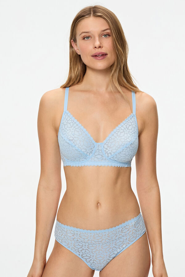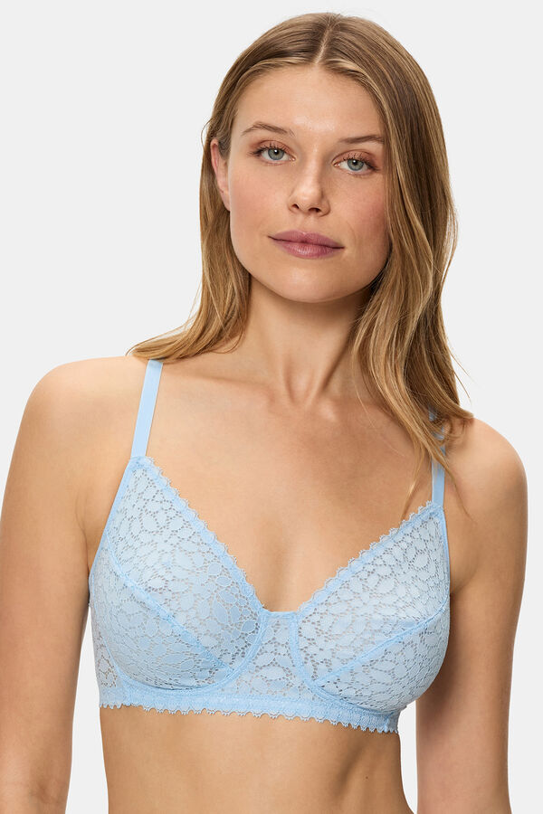 Sujetador de capacidad sin aros de encaje floral. Tirantes anchos y copas cuadradas que realzan el escote. Confeccionado con latearles anchos y espalda en forma de U.