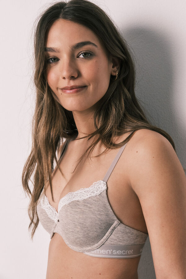 Sujetador clásico BEAUTIFUL con relleno y aro, confeccionado con algodón, en textura de canalé. Con detalle de puntilla de encaje en el escote y goma con logo de bajo del pecho. Una pieza especial para tu colección.