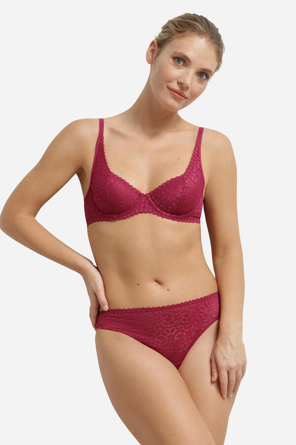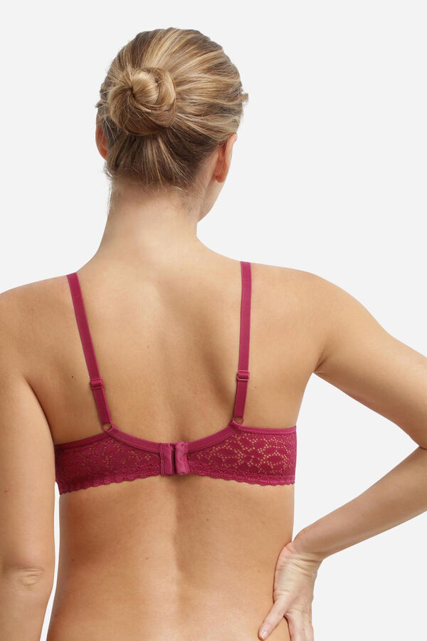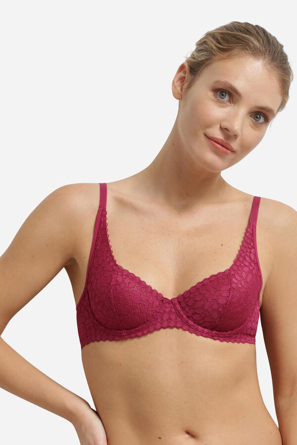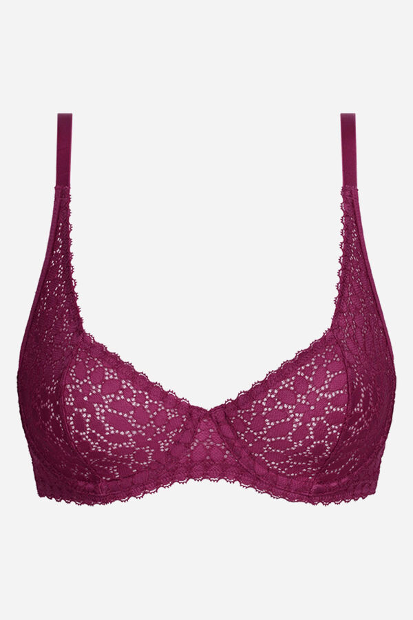 Sujetador de capacidad con aros de encaje floral. Tirantes anchos y copas cuadradas que realzan el escote. Confeccionado con latearles anchos y espalda en forma de U.