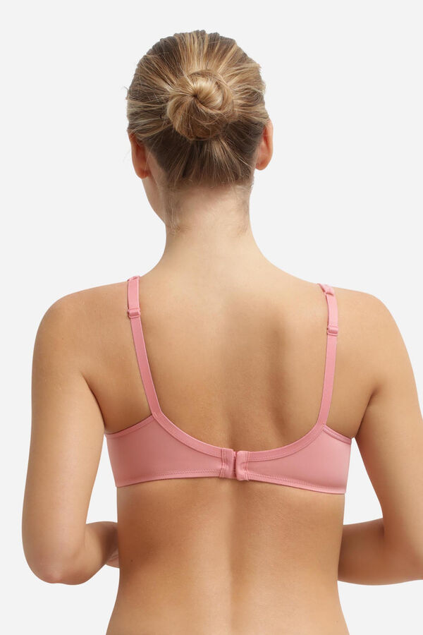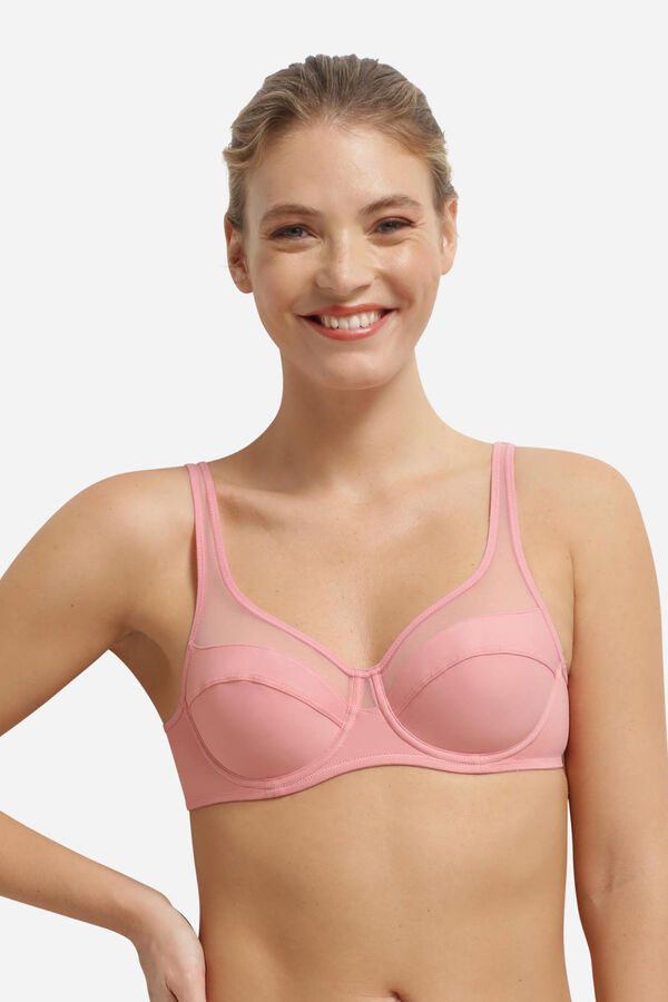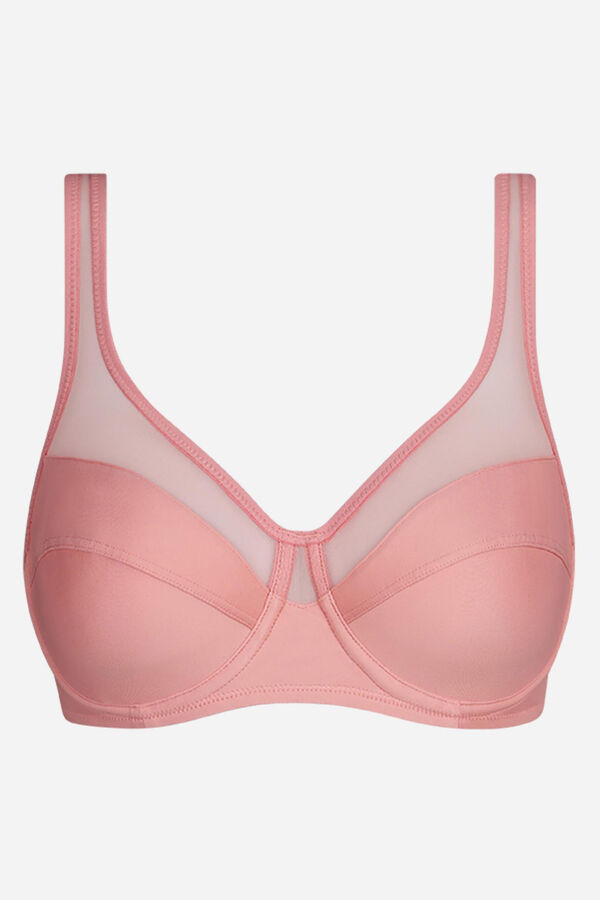 Sujetador con aro de gran capacidad. Copa en 2 partes con costura central, que asegura la sujeción frontal del pecho. Interior de las copas y estructura forradas en malla de poliamida bloqueada, asegura sujeción total. Copas ribeteadas en tul. Tirantes continuos y anchos de tul. Espalda redonda con 2 cierres, 3 posiciones.