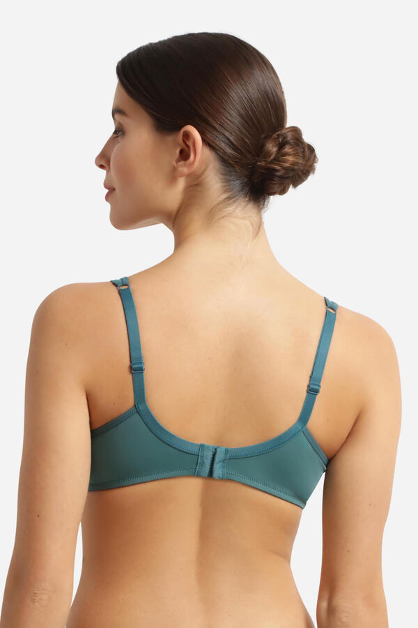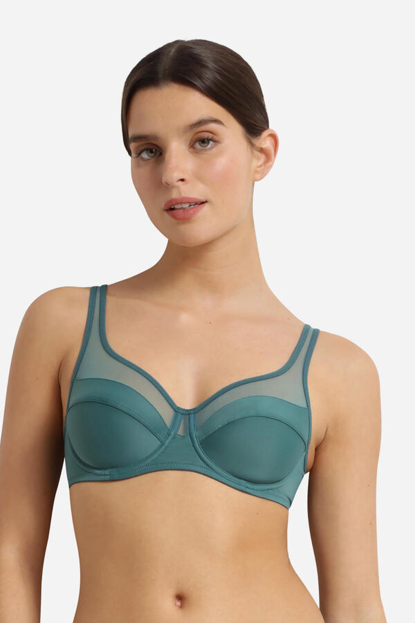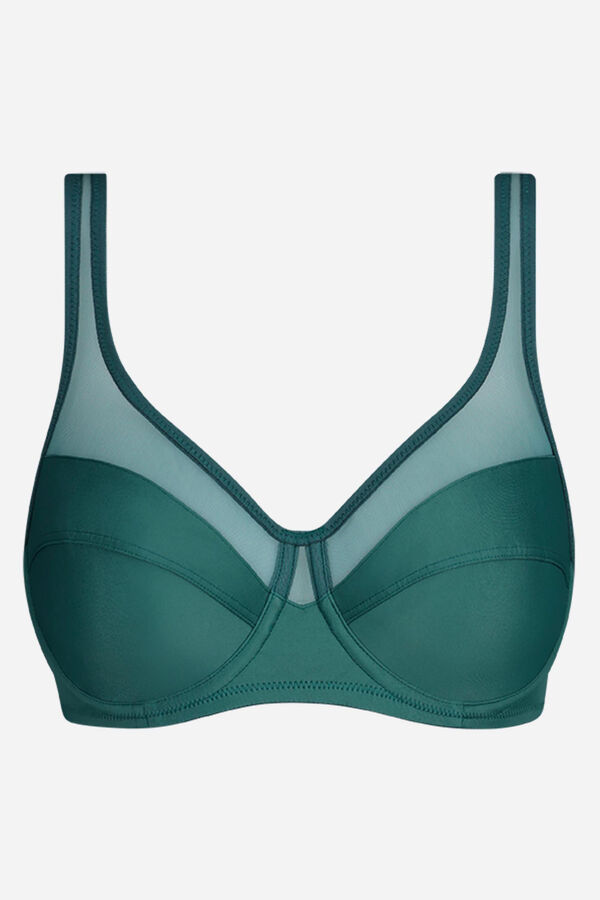 Sujetador con aro de gran capacidad. Copa en 2 partes con costura central, que asegura la sujeción frontal del pecho. Interior de las copas y estructura forradas en malla de poliamida bloqueada, asegura sujeción total. Copas ribeteadas en tul. Tirantes continuos y anchos de tul. Espalda redonda con 2 cierres, 3 posiciones.