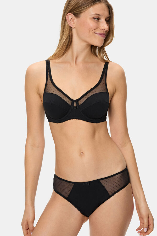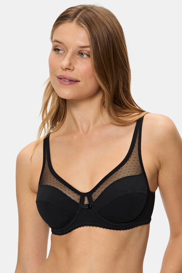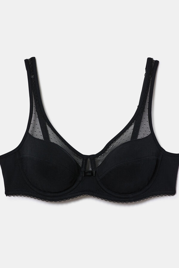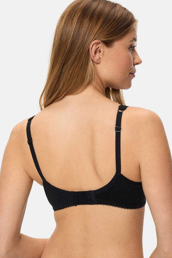 Sujetador con aro de gran capacidad. Confeccionado con algodón ecológico. Sistema de triple sujeción en interior de copa. Espalda redonda: 2 corchetes, 3 posiciones.