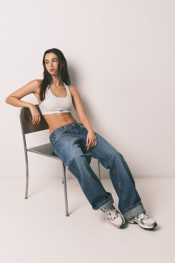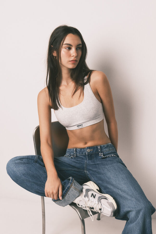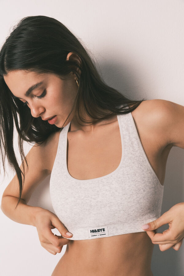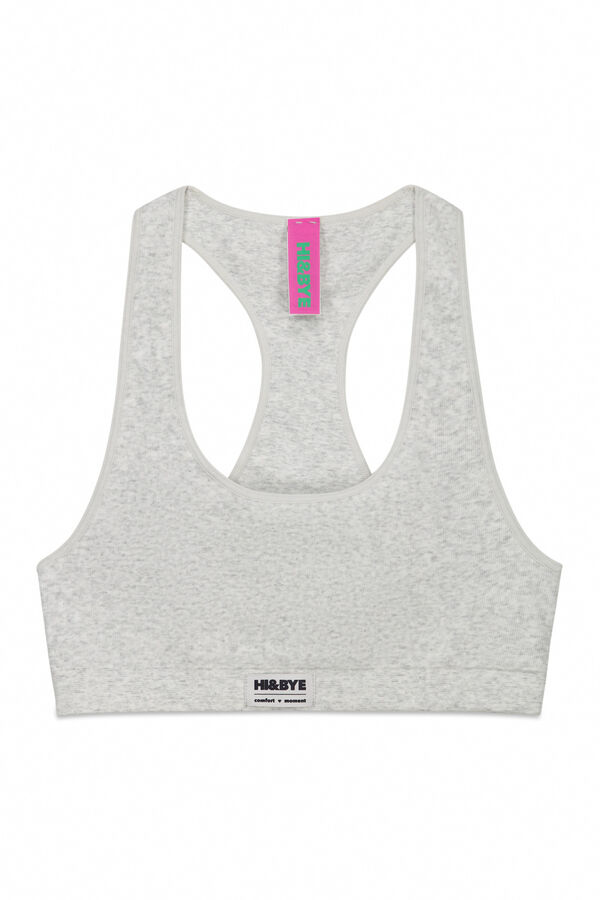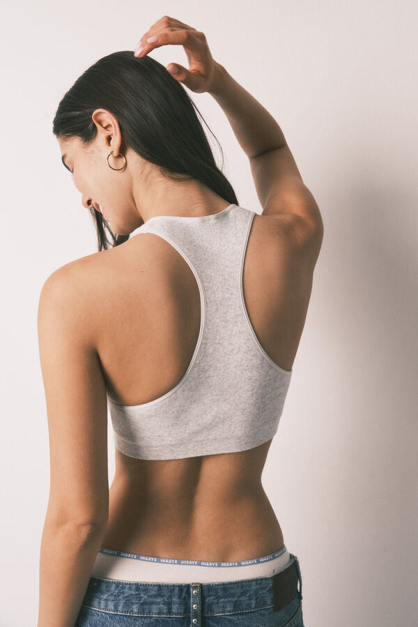 Sujetador Top deportivo con espalda olímpica confeccionado en tejido tipo Seamless, sin costuras. Estructura canalé y copas extraíbles. Detalle de etiqueta con logo en el delantero. Combina con la braga que prefieras para hacerte con un conjunto a todo color. Wear a Happy Attitude!