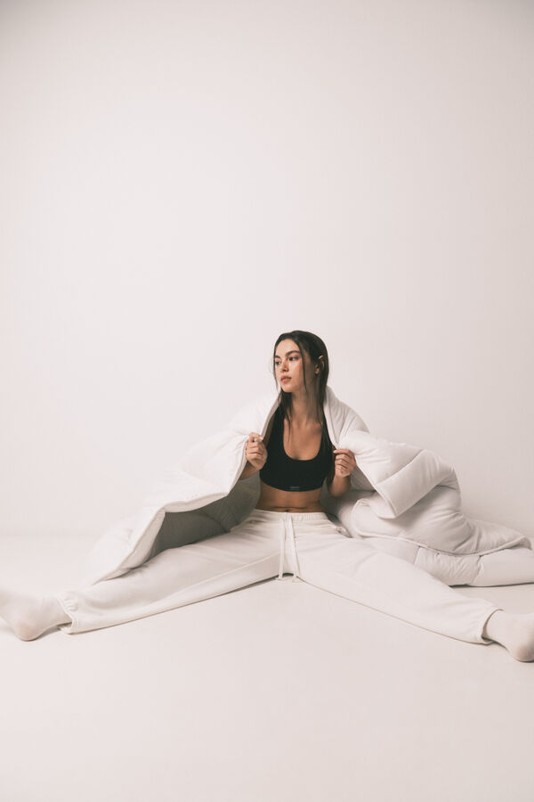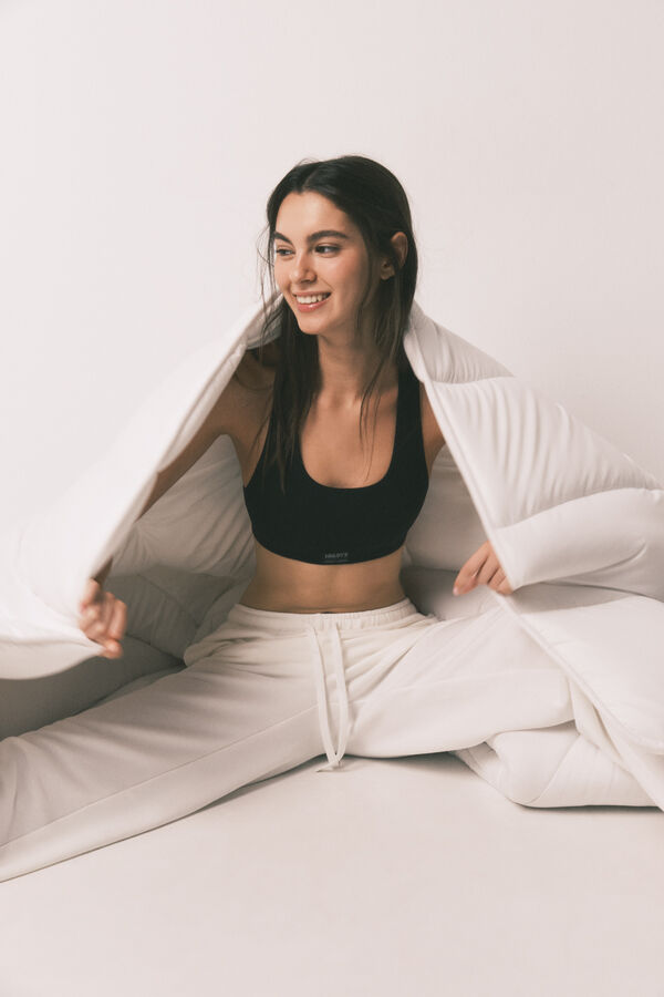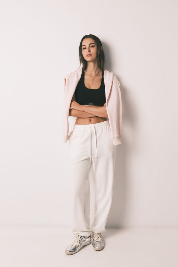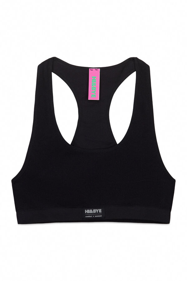 Sujetador Top deportivo con espalda olímpica confeccionado en tejido tipo Seamless, sin costuras. Estructura canalé y copas extraíbles. Detalle de etiqueta con logo en el delantero. Combina con la braga que prefieras para hacerte con un conjunto a todo color. Wear a Happy Attitude!