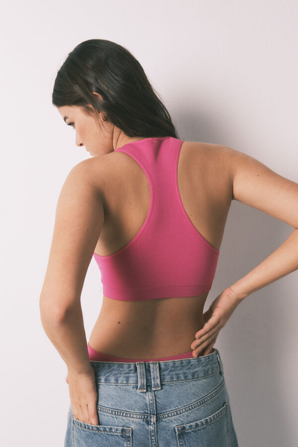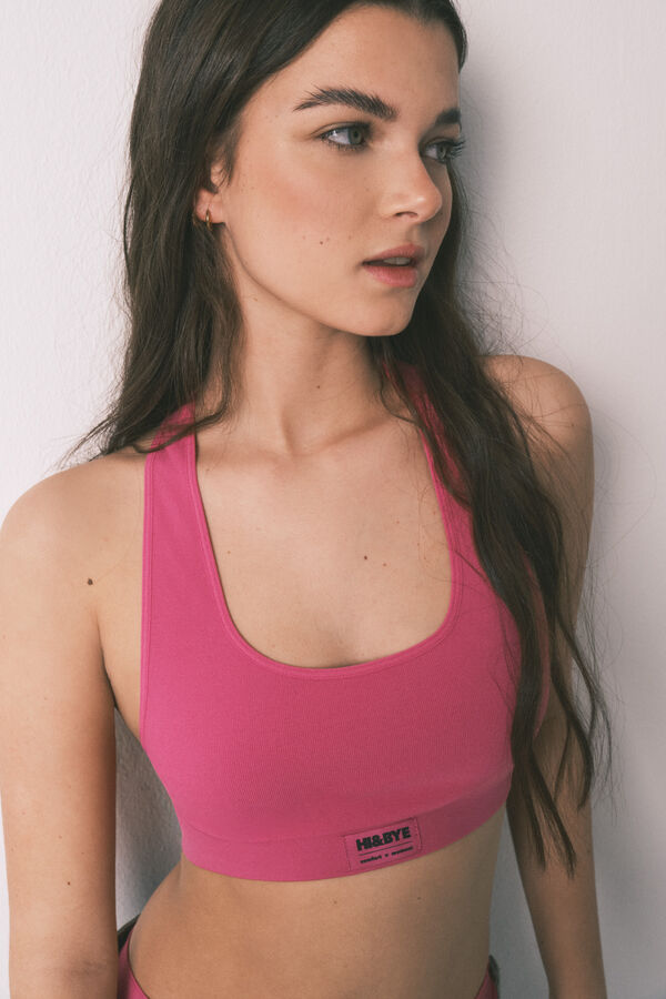 Sujetador Top deportivo con espalda olímpica confeccionado en tejido tipo Seamless, sin costuras. Estructura canalé y copas extraíbles. Detalle de etiqueta con logo en el delantero. Combina con la braga que prefieras para hacerte con un conjunto a todo color. Wear a Happy Attitude!