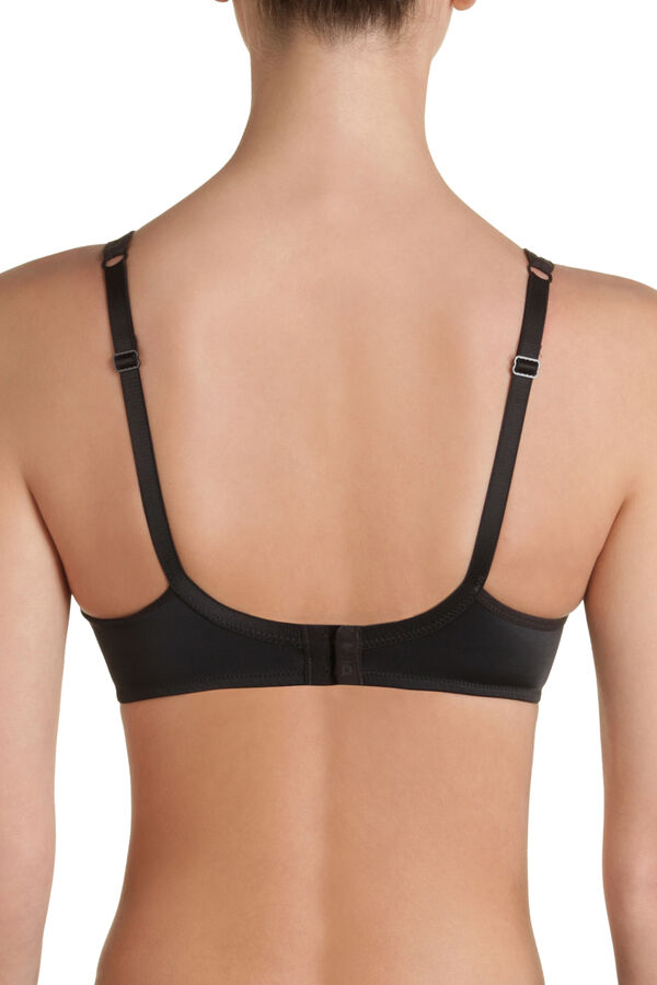 Sujetador sin aros de gran capacidad. Copa en 2 partes con costura central, que asegura la sujeción frontal del pecho. Interior de las copas y estructura forradas en malla de poliamida bloqueada, asegura sujeción total. Copas ribeteadas en tul. Tirantes continuos y anchos de tul. Espalda redonda con 2 cierres, 3 posiciones.