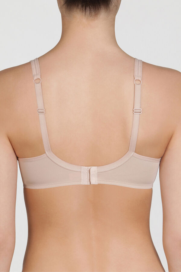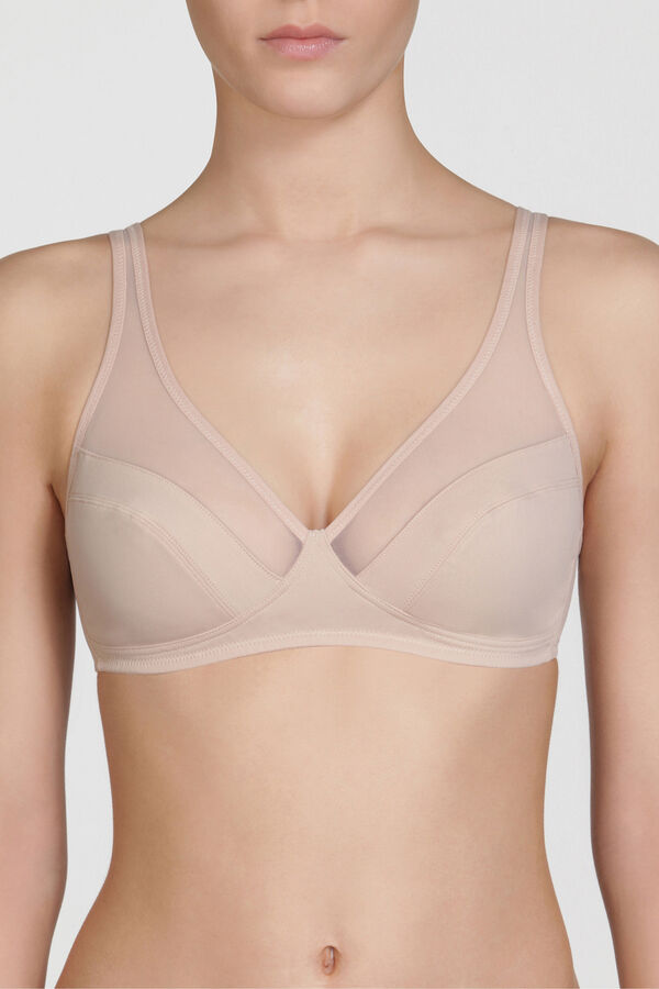 Sujetador sin aros de gran capacidad. Copa en 2 partes con costura central, que asegura la sujeción frontal del pecho. Interior de las copas y estructura forradas en malla de poliamida bloqueada, asegura sujeción total. Copas ribeteadas en tul. Tirantes continuos y anchos de tul. Espalda redonda con 2 cierres, 3 posiciones.