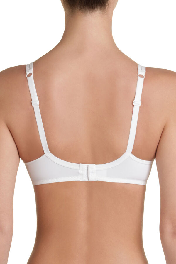 Sujetador sin aros de gran capacidad. Copa en 2 partes con costura central, que asegura la sujeción frontal del pecho. Interior de las copas y estructura forradas en malla de poliamida bloqueada, asegura sujeción total. Copas ribeteadas en tul. Tirantes continuos y anchos de tul. Espalda redonda con 2 cierres, 3 posiciones.