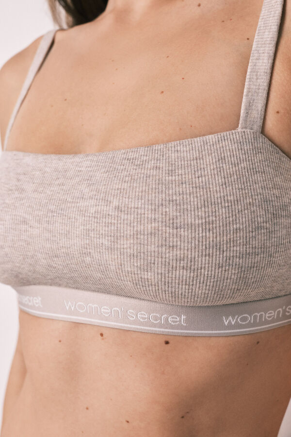 Sujetador tipo top, con escote recto y sin relleno, confeccionado con algodón, en tejido de canalé. Con detalle de goma con logo de bajo del pecho. Para quienes buscan comodidad sin renunciar a la sujeción.