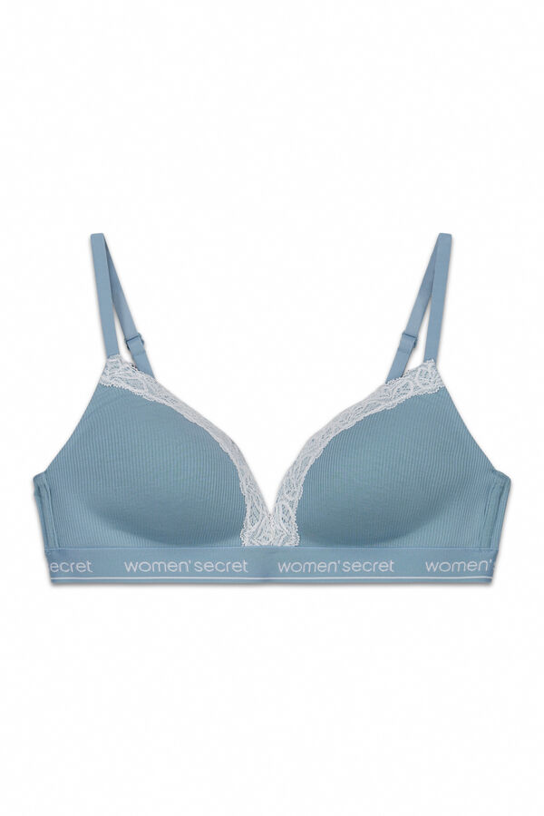 Sujetador triangular CHARMING con relleno y sin aro, confeccionado con algodón, en tejido de canalé. Con detalle de encaje en el escote y goma con logo de bajo del pecho. Para quienes buscan comodidad sin renunciar a la sujeción.