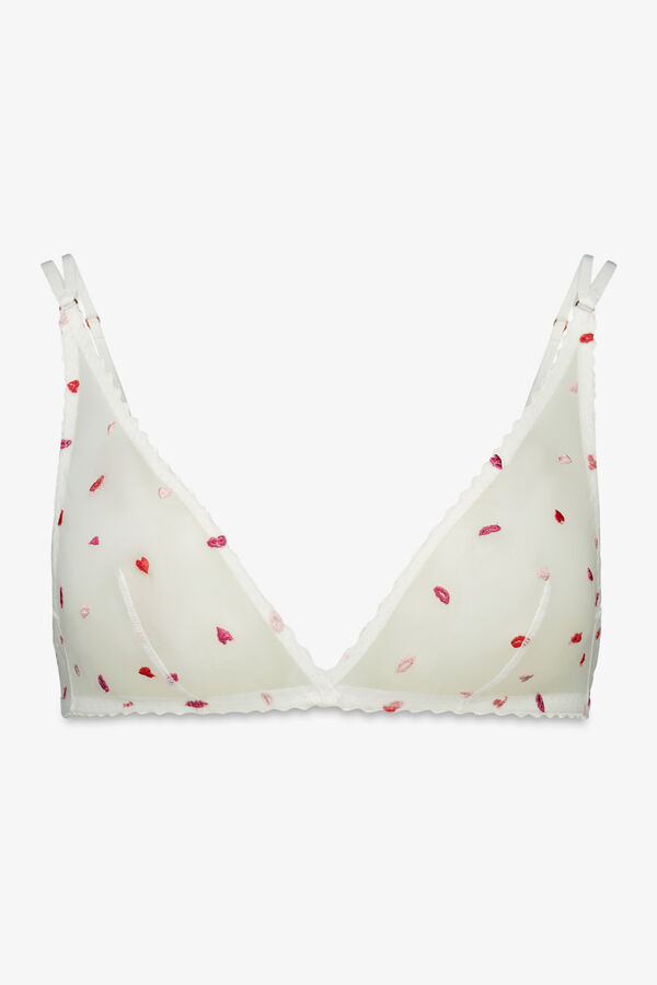 Sujetador FANTASTIC triangular halter, confeccionado en tejido de tul con detalles bordados de corazones y labios a contraste. Diseño sin relleno y sin aro para las amantes de la sujeción sin perder la comodidad. Ideal para tu día a día.