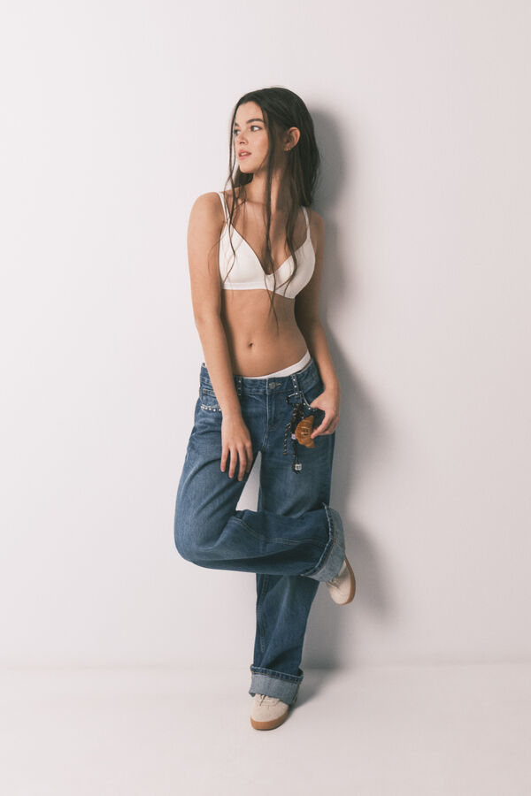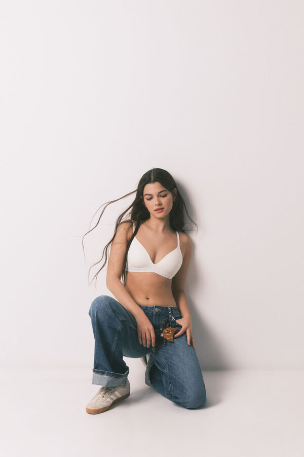 Sujetador triangular con relleno, confeccionado en algodón con estructura canalé o en liso. Goma elástica bajo pecho con Jacquard con logo de la marca. Combínalo con la braga que prefieras para hacerte con un conjunto a todo color. Wear a Happy Attitude!