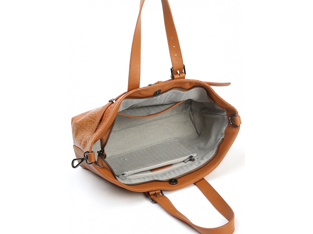 Одно основное отделение, внутри два надежных кармана на молнии для самых ценных предметов и один удобный открытый карман для легкого доступа к телефону, ключам и другим мелочам.
