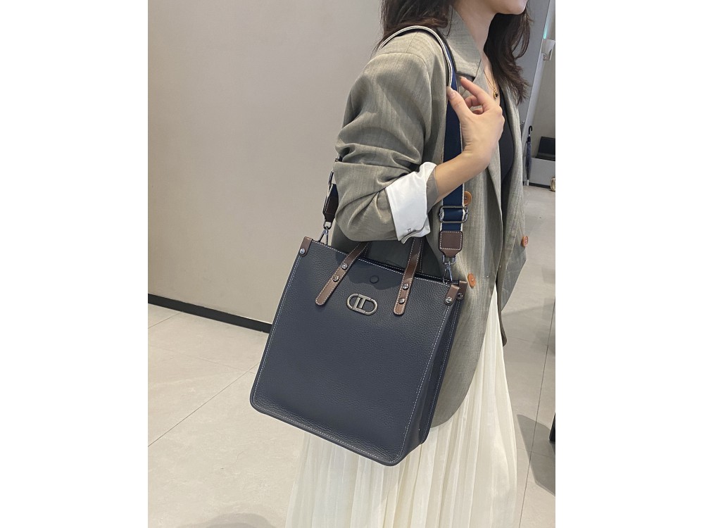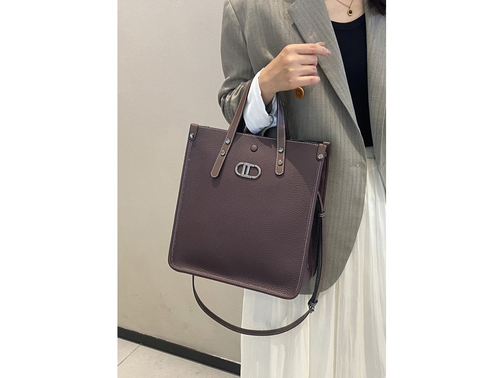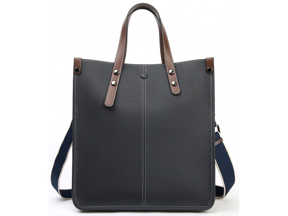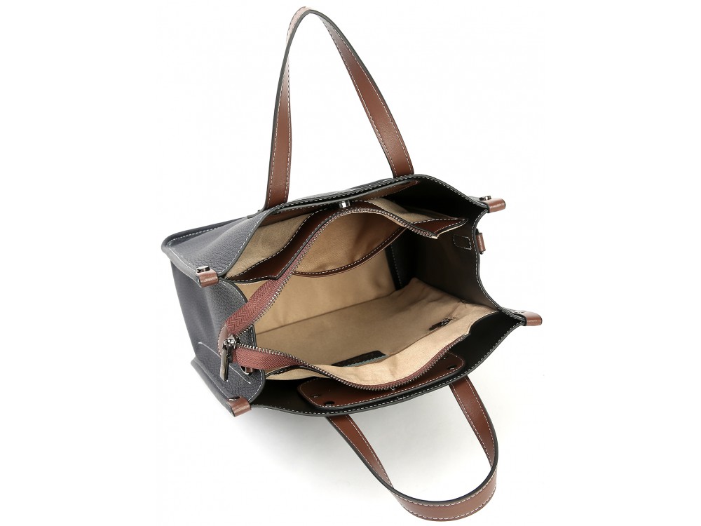 Две короткие ручки. Текстильный ремень на плечо + длинный кожаный ремень с возможностью регулировки. Три основаных отделения. Одно застегивается на молнию + внутри карман для телефона, дополнительный карман для аксессуаров на молнии. Два других отделения застегиваются на магнитную клепку.