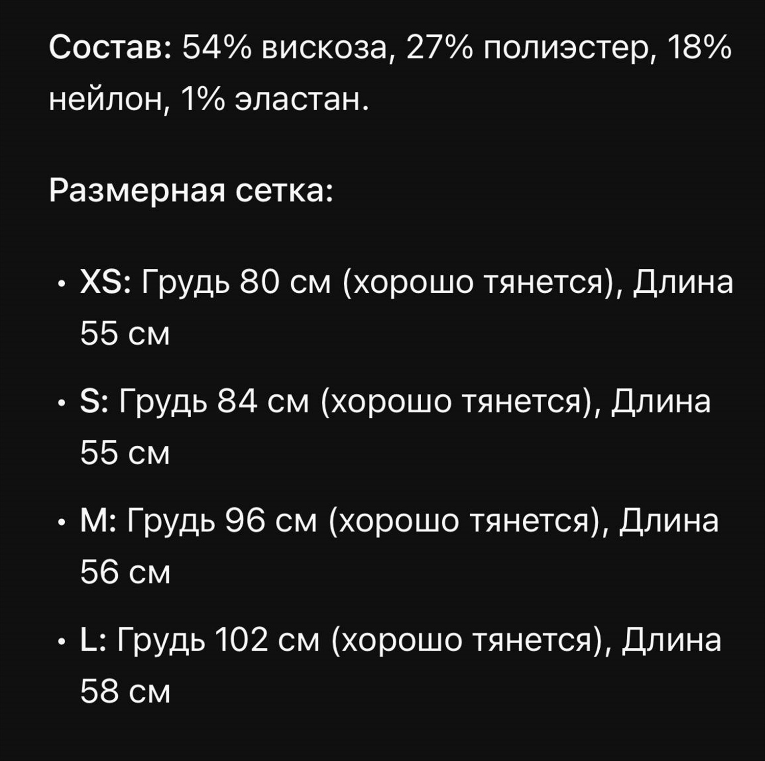 Материал: 54% вискоза, 27% полиэстер, 18% нейлон, 1% эластан
