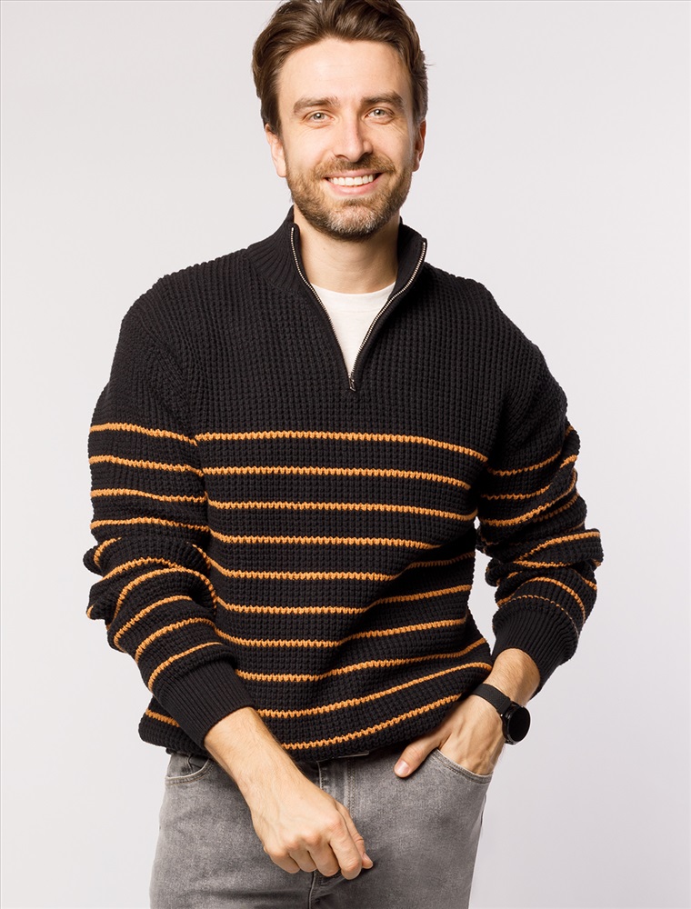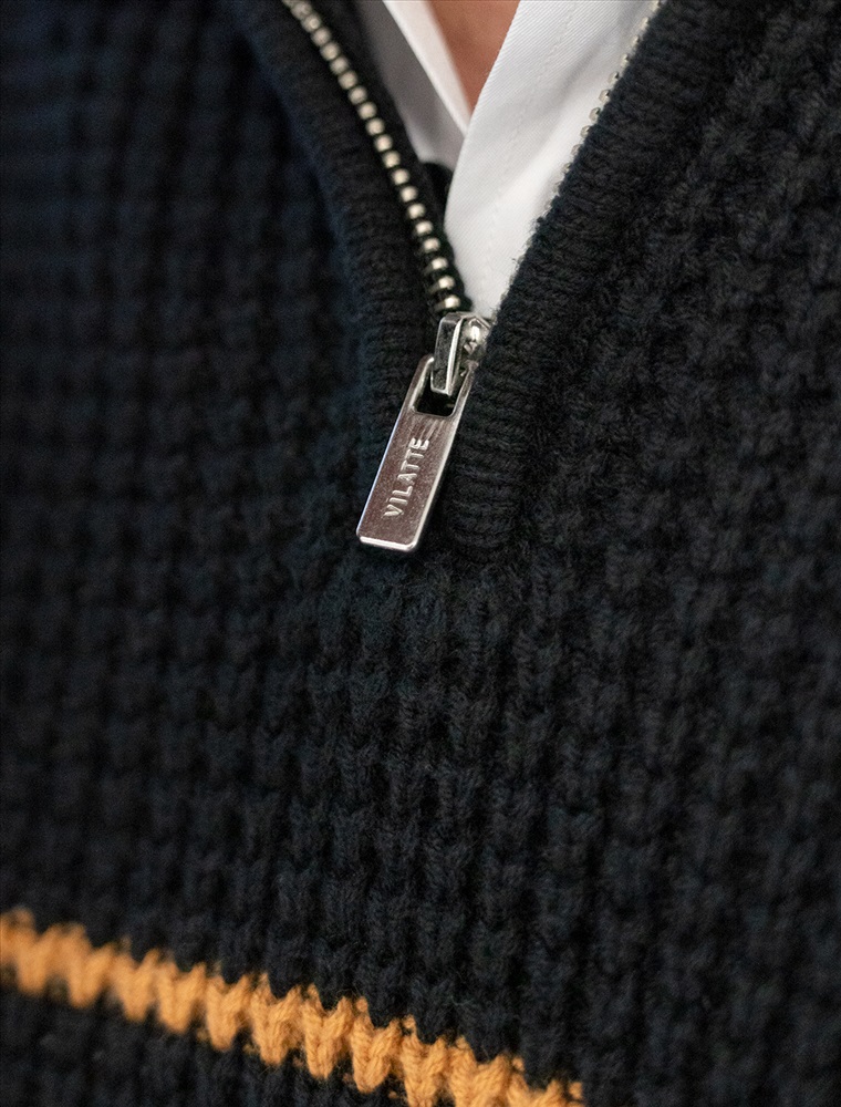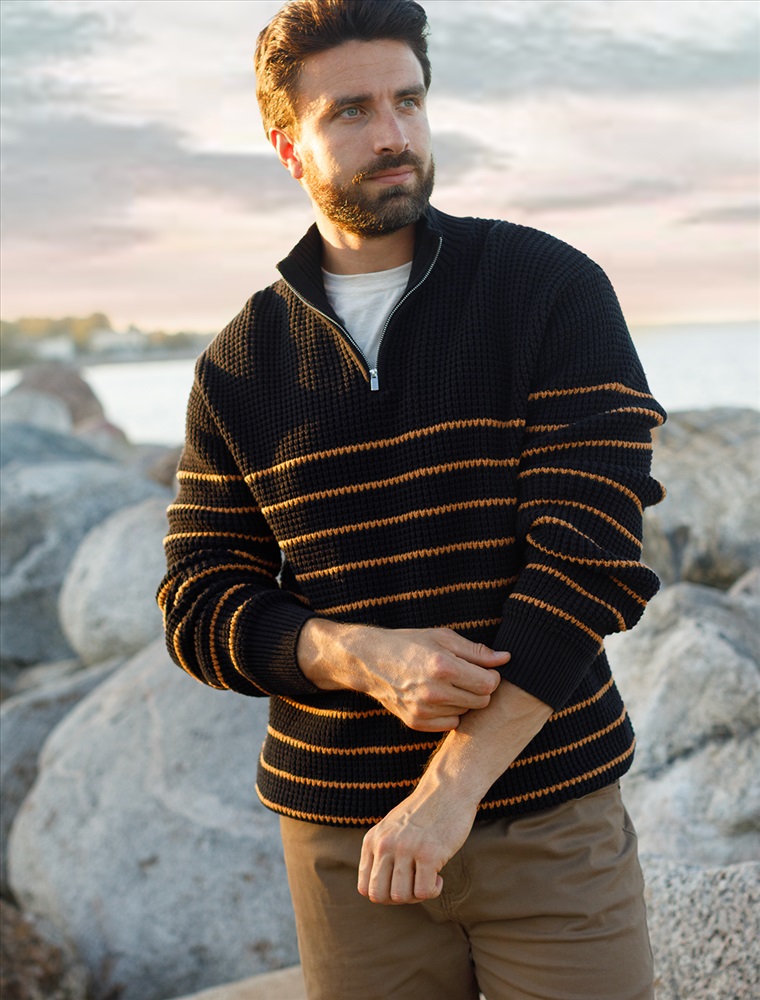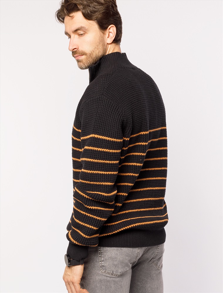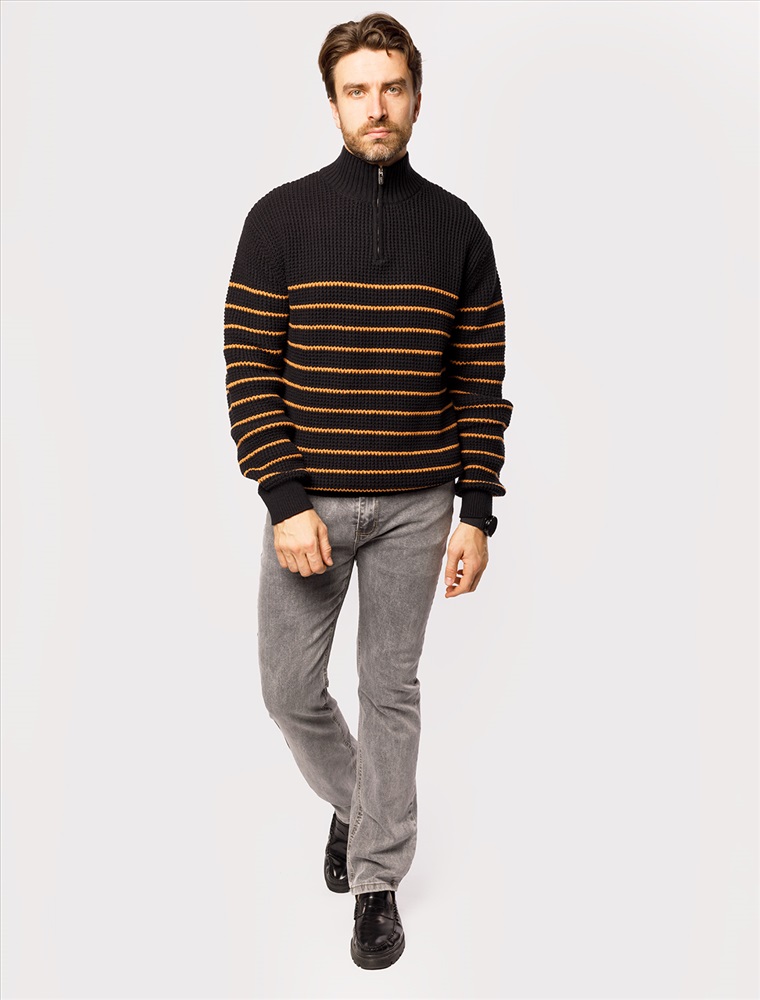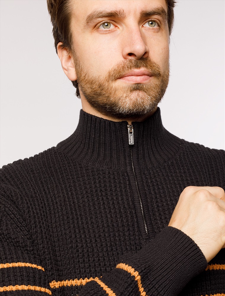 Параметры модели на первом фото: Рост 190, бюст 108, талия 87, бедра 104 Свитер с узором полосы выполнен из хлопковой пряжи с добавлением акрила. Теплая модель фактурной крупной вязки с воротом, застегивается металлической молнией. Регулируя ворот можно носить с рубашками, футболками и водолазками. Кроме того, свитер совершенно не колется, поэтому его комфортно носить даже на голое тело. Внизу изделия нашивка бренда из эко-кожи. Комментарии к товару