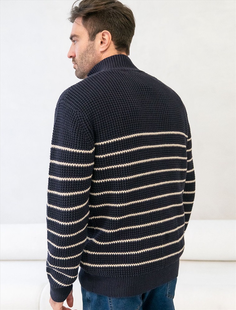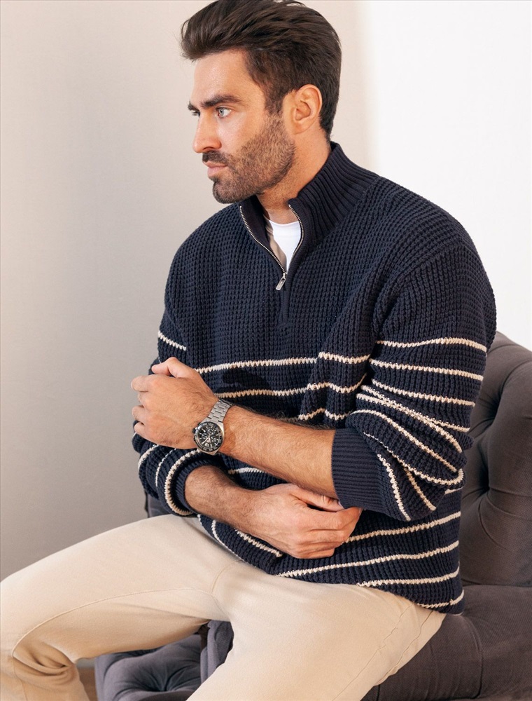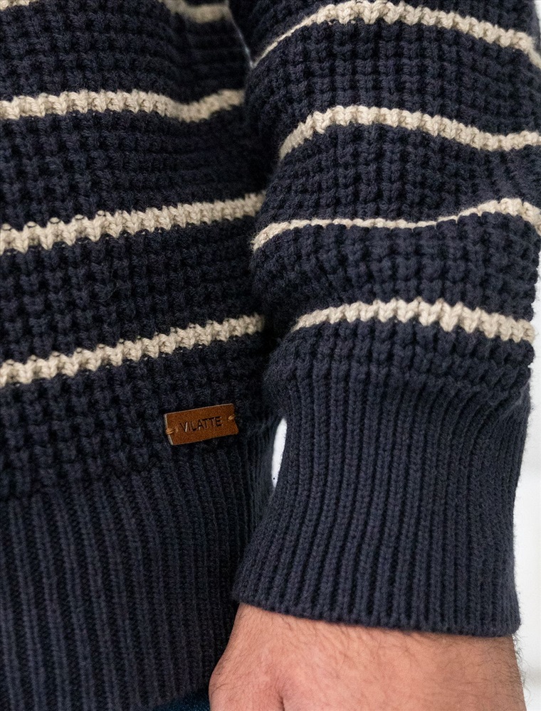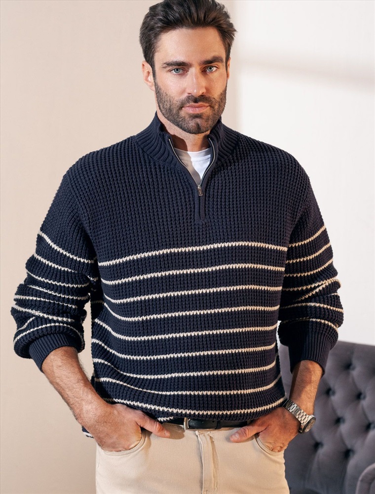 Параметры модели на первом фото: Рост 190, бюст 108, талия 87, бедра 104 Свитер с узором полосы выполнен из хлопковой пряжи с добавлением акрила. Теплая модель фактурной крупной вязки с воротом, застегивается металлической молнией. Регулируя ворот можно носить с рубашками, футболками и водолазками. Кроме того, свитер совершенно не колется, поэтому его комфортно носить даже на голое тело. Внизу изделия нашивка бренда из эко-кожи.