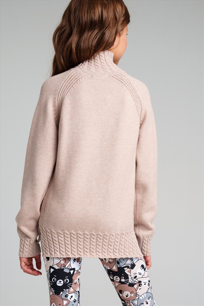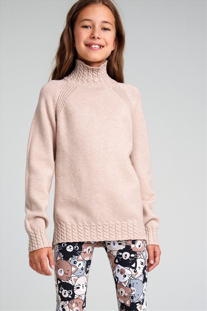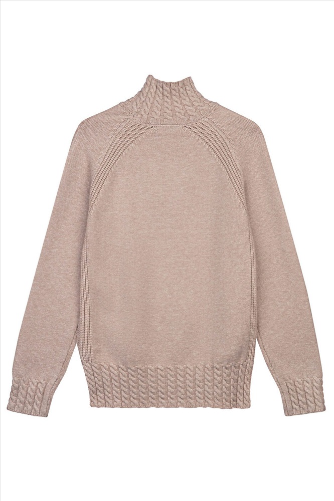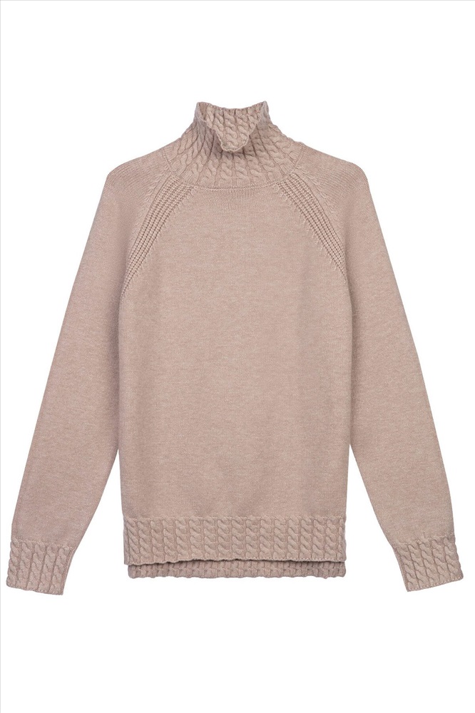 Свитер из вязаного трикотажа. Высокое содержание вискозы 50%. Вискоза отличается высокой гигроскопичностью - она впитывает влагу и отлично сохраняет тепло. Воротник-стойка. Горловина, манжеты и низ изделия с переплетением "косичка". Посадка comfort fit - свободный крой.