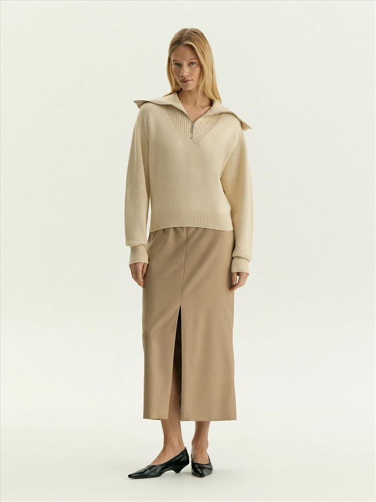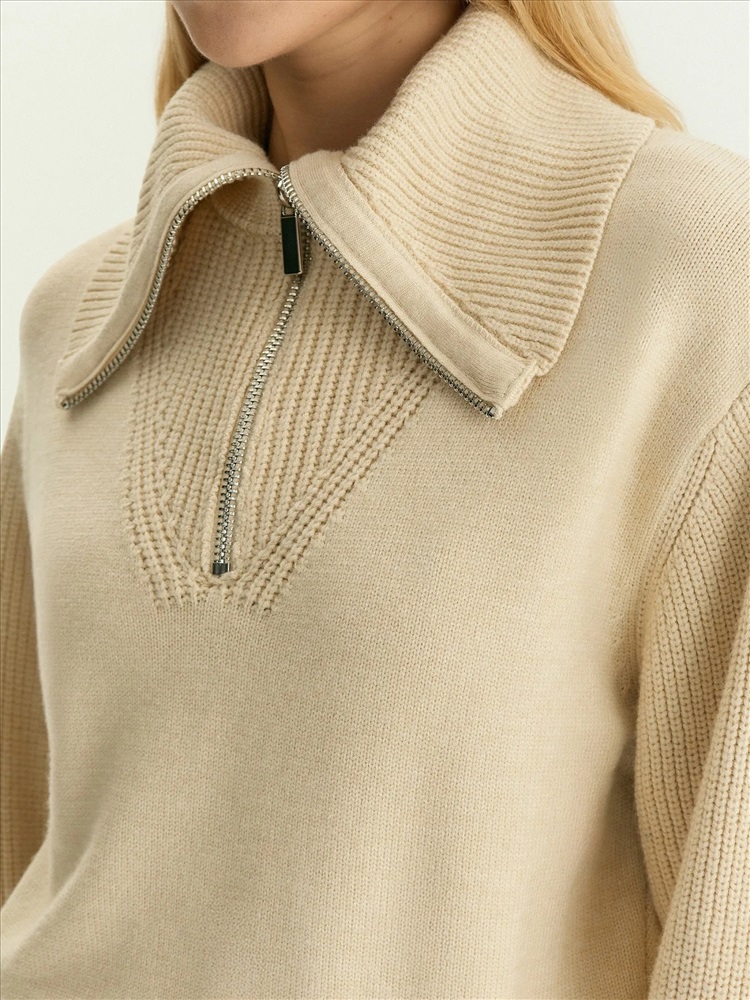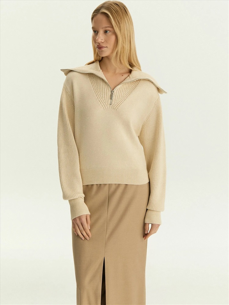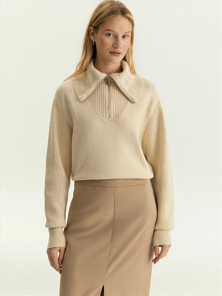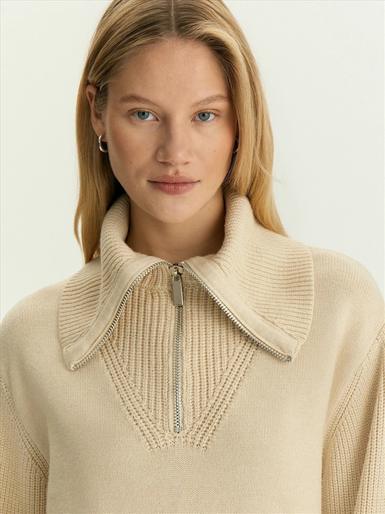Укороченный и приталенный джемпер на молнии с воротником "апаш" придаст особый шарм кэжуальным образам. Низ, выполненный резинкой, создаёт красивый переход от объема к прилеганию. Два типа вязки вносят визуальное разнообразие, а молочный цвет обеспечивает широкую сочетаемость. Материал наполовину состоит из вискозы, что делает его дышащим и комфортным, а благодаря нейлону джемпер защищает от холодного ветра, хорошо держит цвет и быстро сохнет.