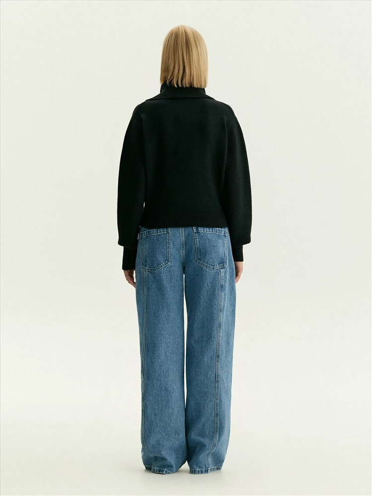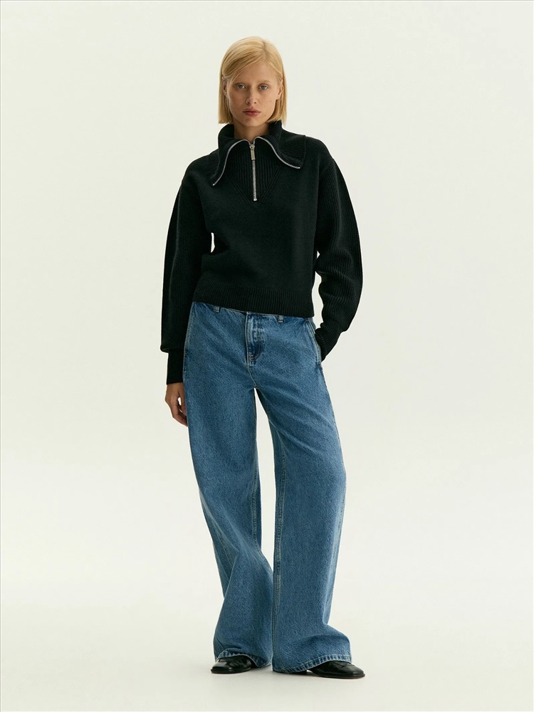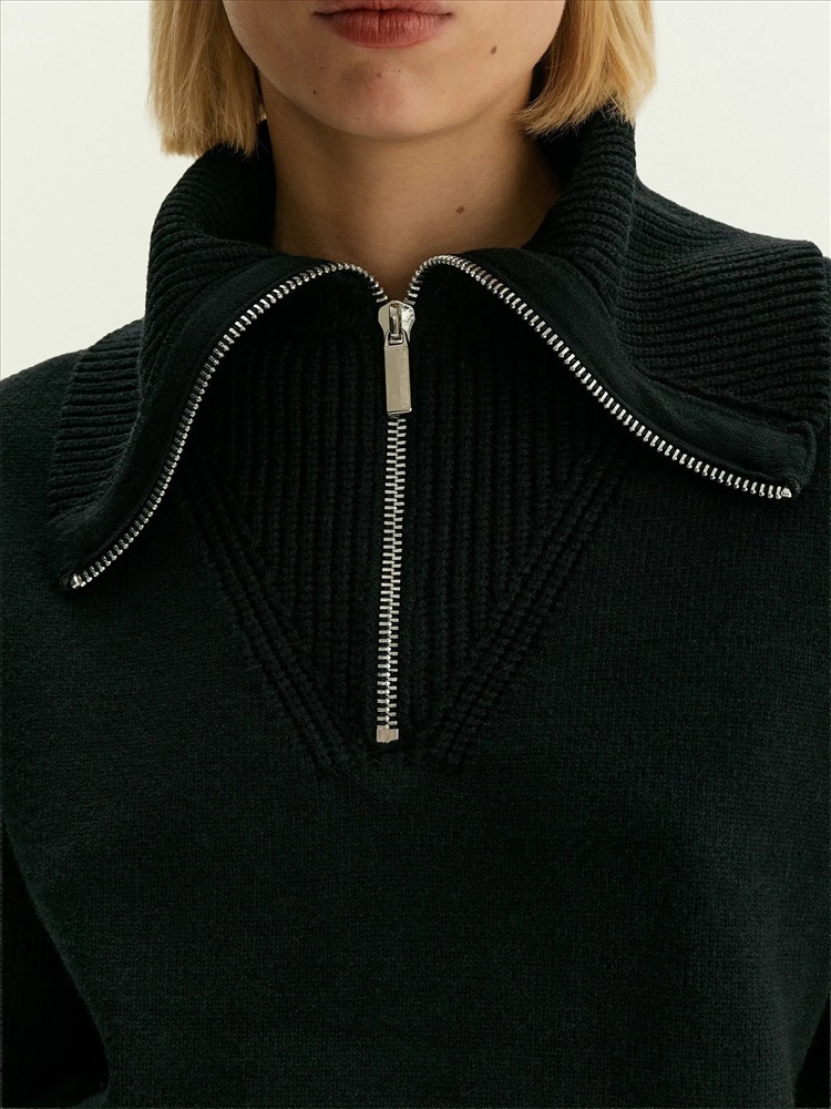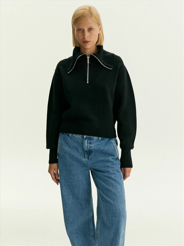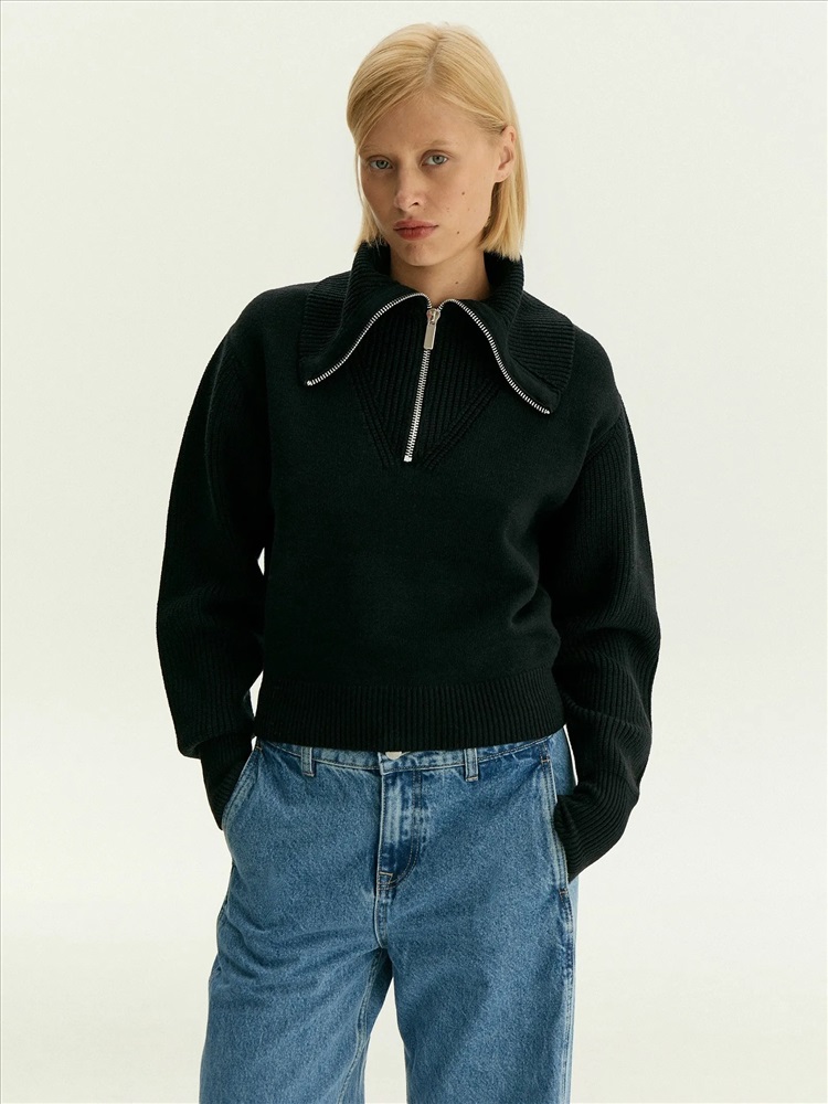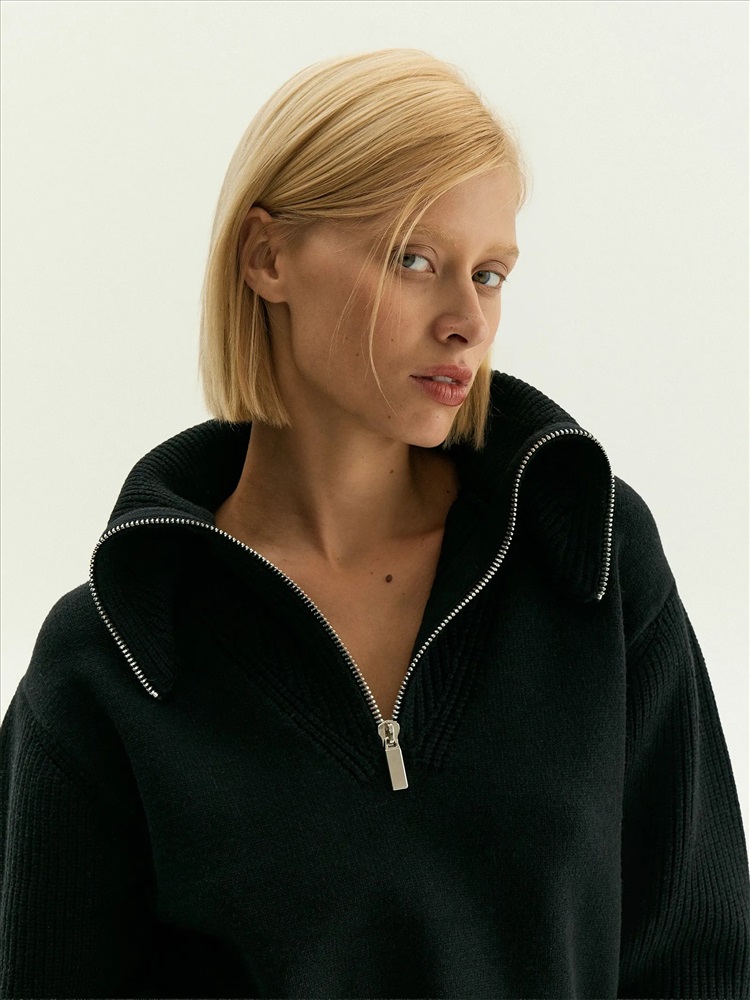 Укороченный и приталенный джемпер на молнии с воротником "апаш" придаст особый шарм кэжуальным образам. Низ, выполненный резинкой, создаёт красивый переход от объема к прилеганию. Два типа вязки вносят визуальное разнообразие, а чёрный цвет обеспечивает широкую сочетаемость. Материал наполовину состоит из вискозы, что делает его дышащим и комфортным, а благодаря нейлону джемпер защищает от холодного ветра, хорошо держит цвет и быстро сохнет.