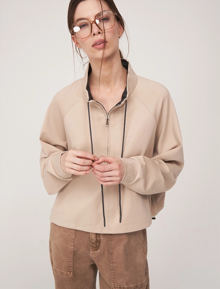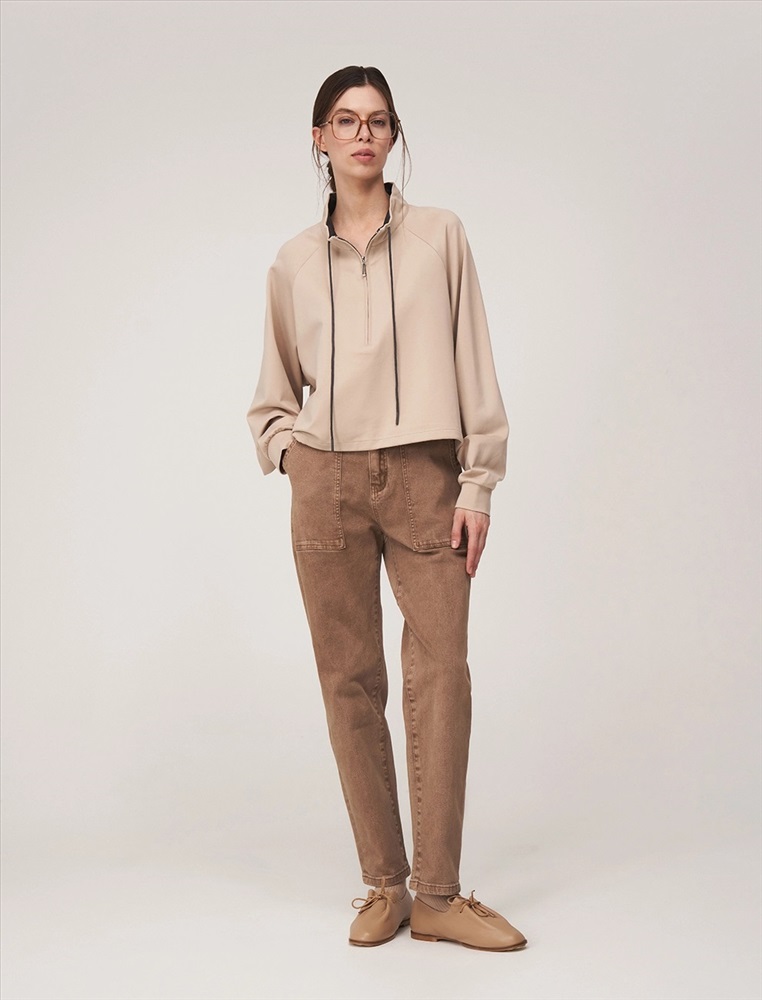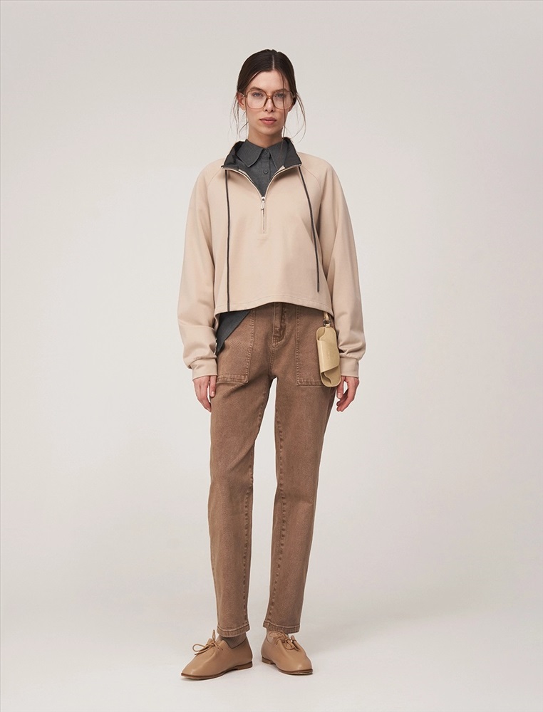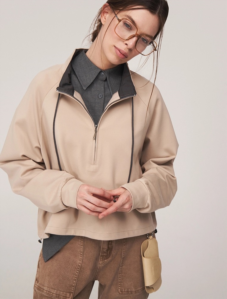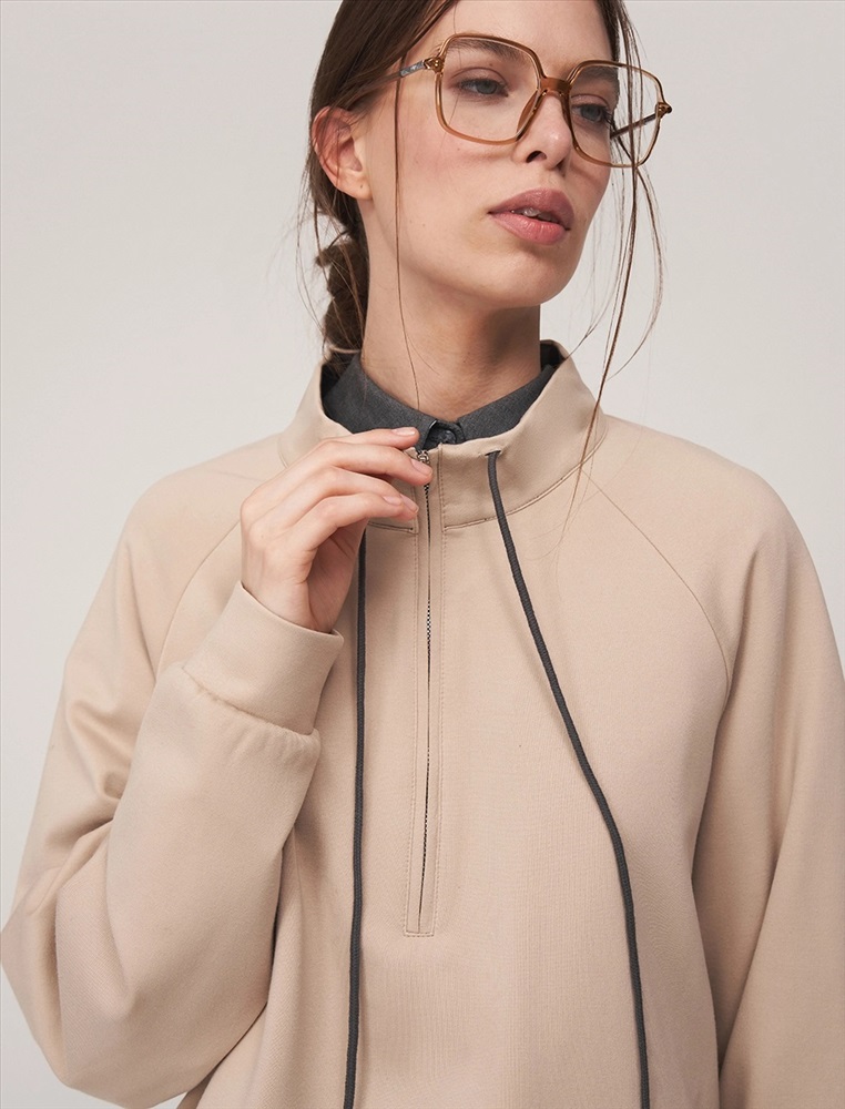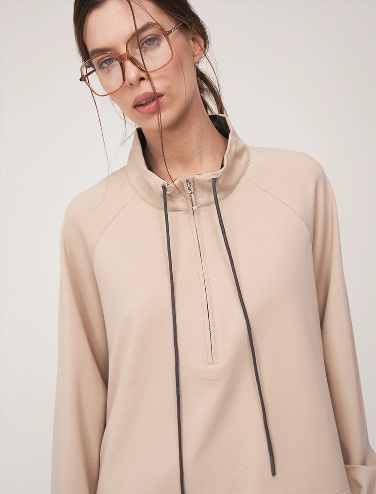 Видео: https-//hassfashion.ru/upload/iblock/1cc/hro075vvojqw33rro38u4ppj4ftkivy9.mp4 осень-зима А: 95% Хлопок, 5% Спандекс; В: 100% Хлопок Джемпер регулярного силуэта с воротником и рукавом по типу реглан. По передней части изделия — застежка доходящая до уровня ниже груди. По воротнику встроен шнурок. Выполнен из хлопка с небольшим добавлением спандекса. Лицевая часть в бежевом оттенке. Изнанка и шнурок контрастного оттенка.