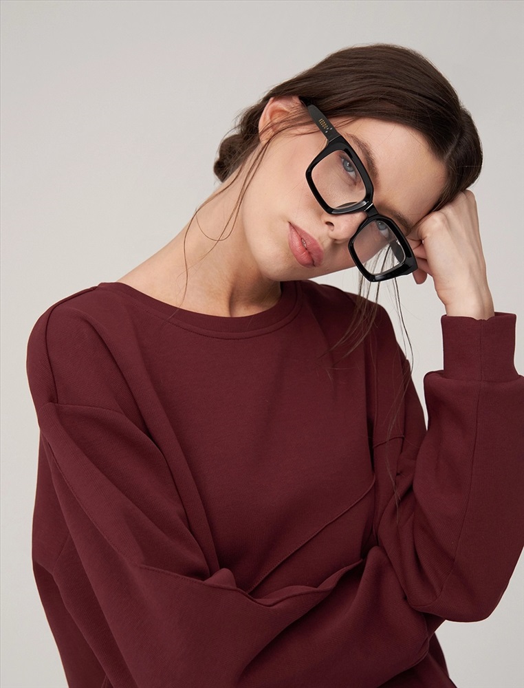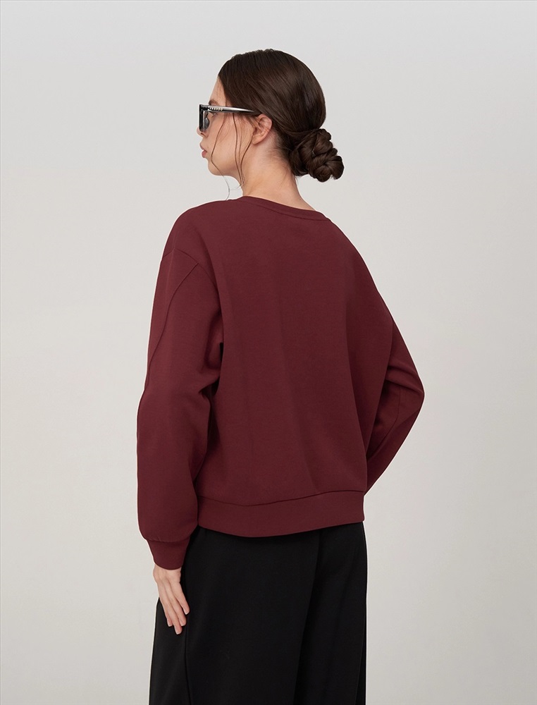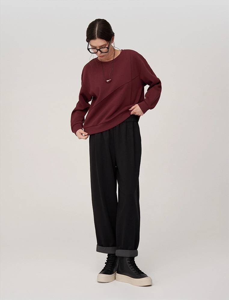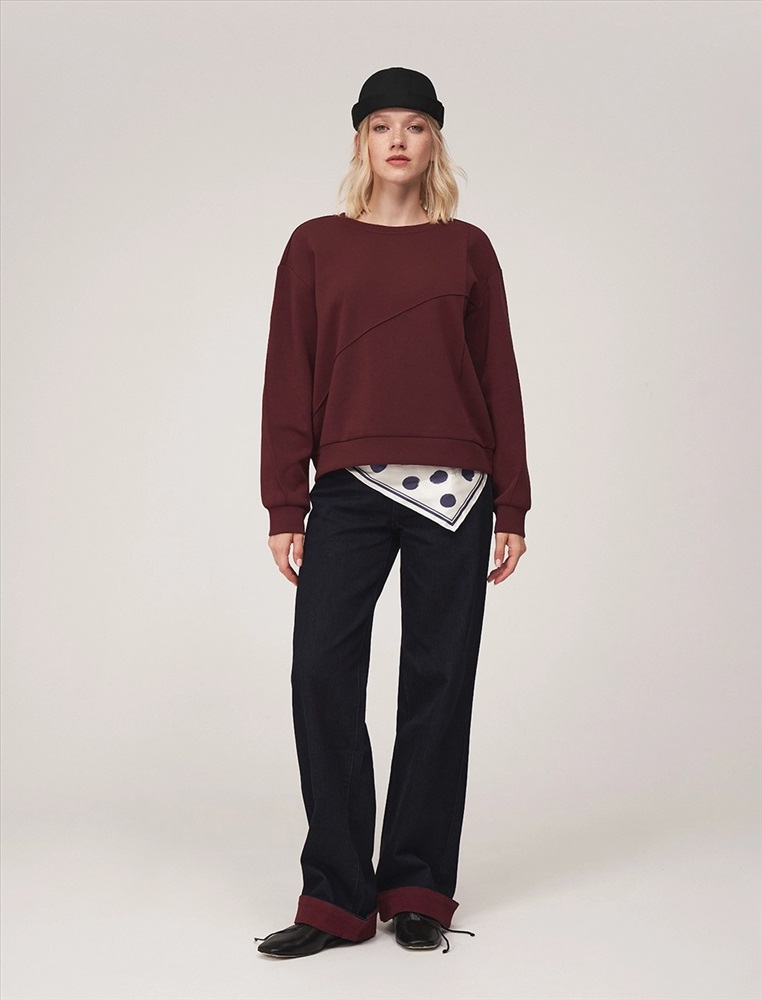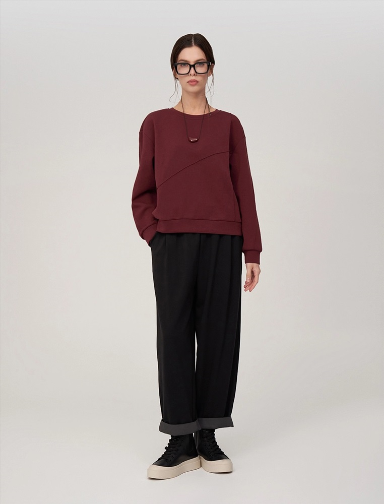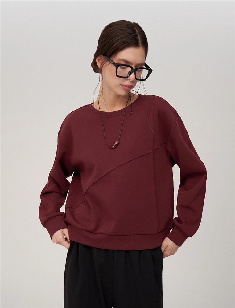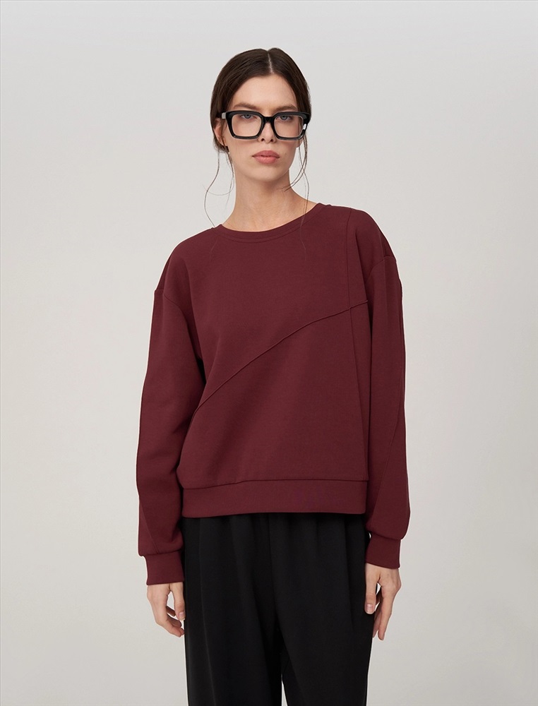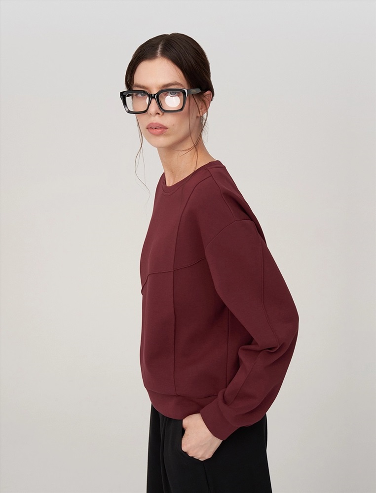 Свитшот регулярного силуэта с R-neck горловиной. Линия плеча спущена. По переду вертикальная и диагональная резы. По низу и по манжетам вставки из основной ткани. Выполнен из хлопка (85%), полиэстера и спандекса. Представлен в бордовом оттенке.