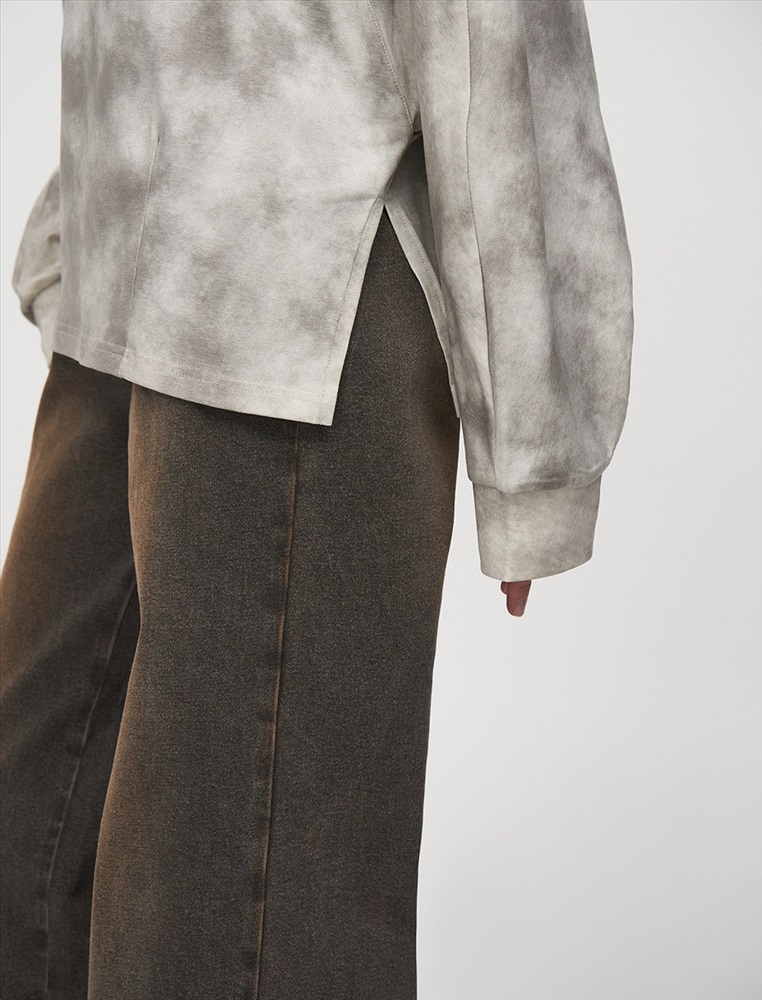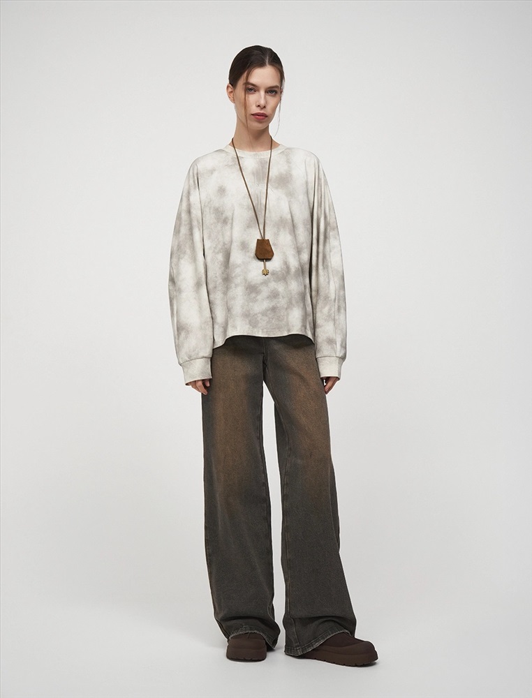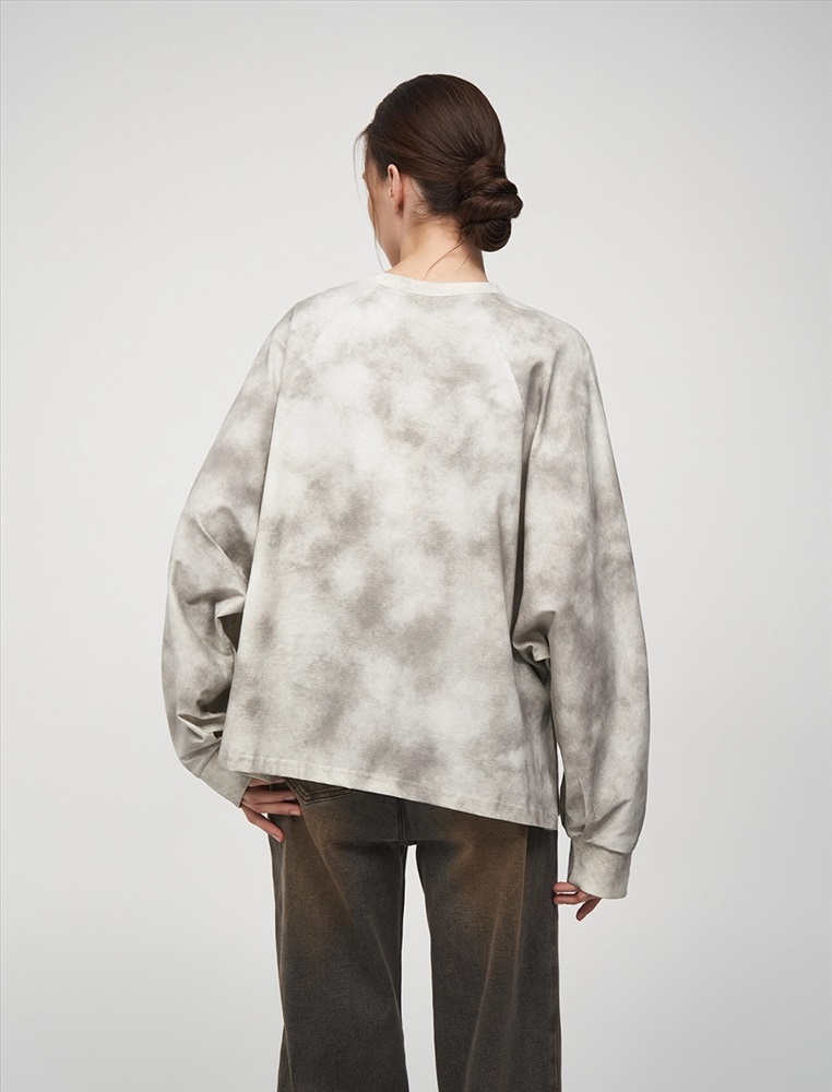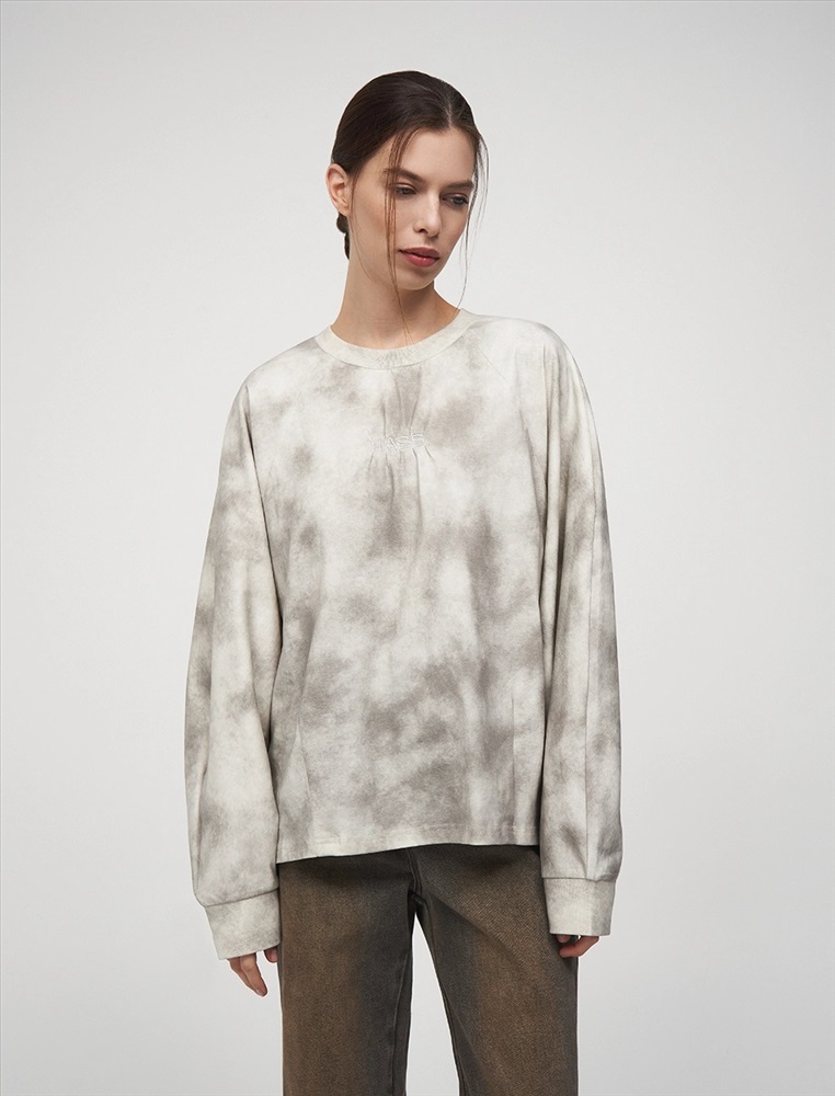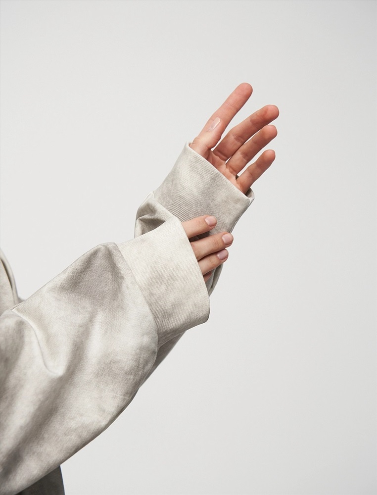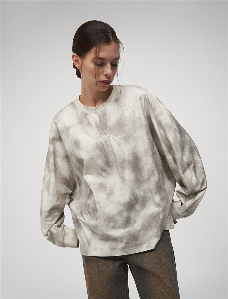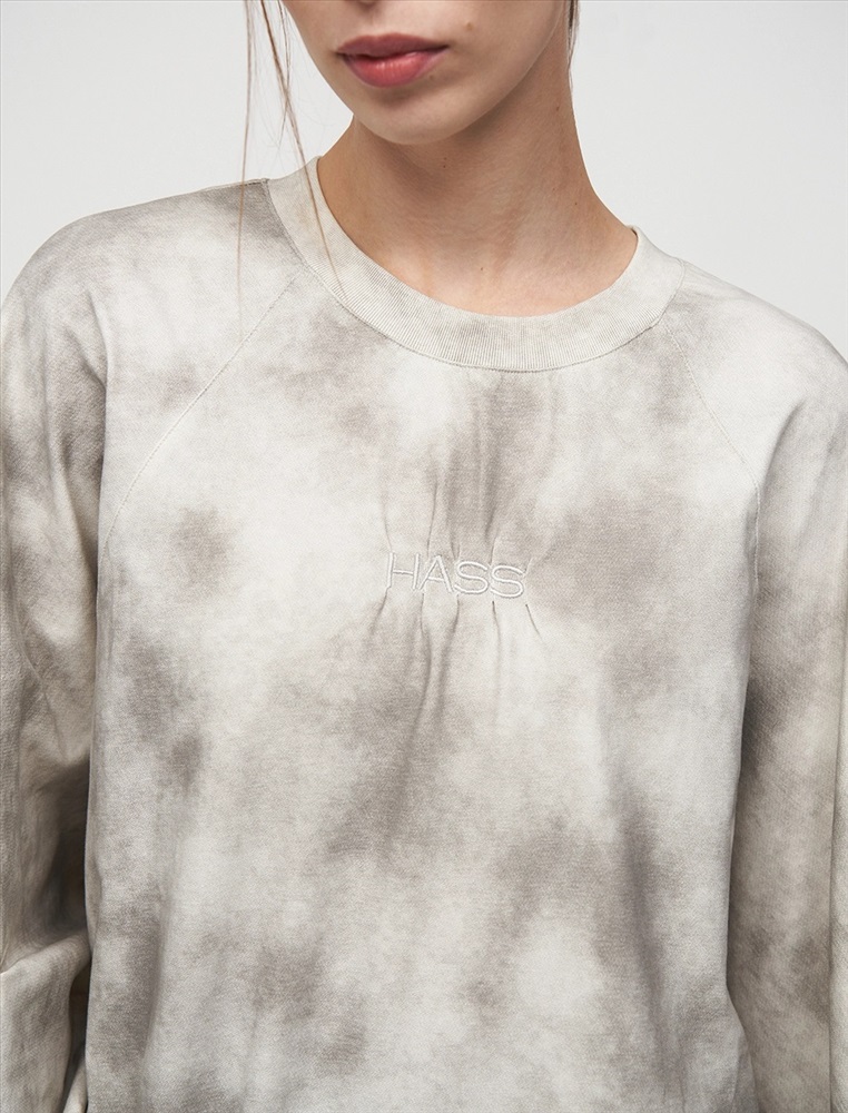 Свитшот регулярного силуэта с рукавом по типу реглан. Горловина по типу R-neck. По низу застроченные вертикальные складки. По бокам — вырезы. По передней части, на уровне груди на складках расположена вышивка HASS. Ткань имеет трендовый состаренный эффект. Выполнен из хлопка и терилена с добавлением спандекса. Представлен в сером оттенке.