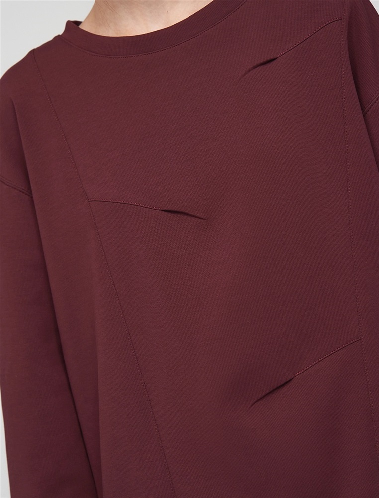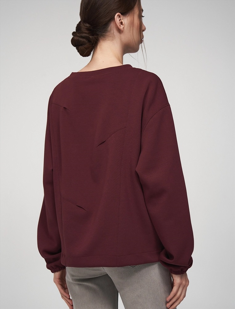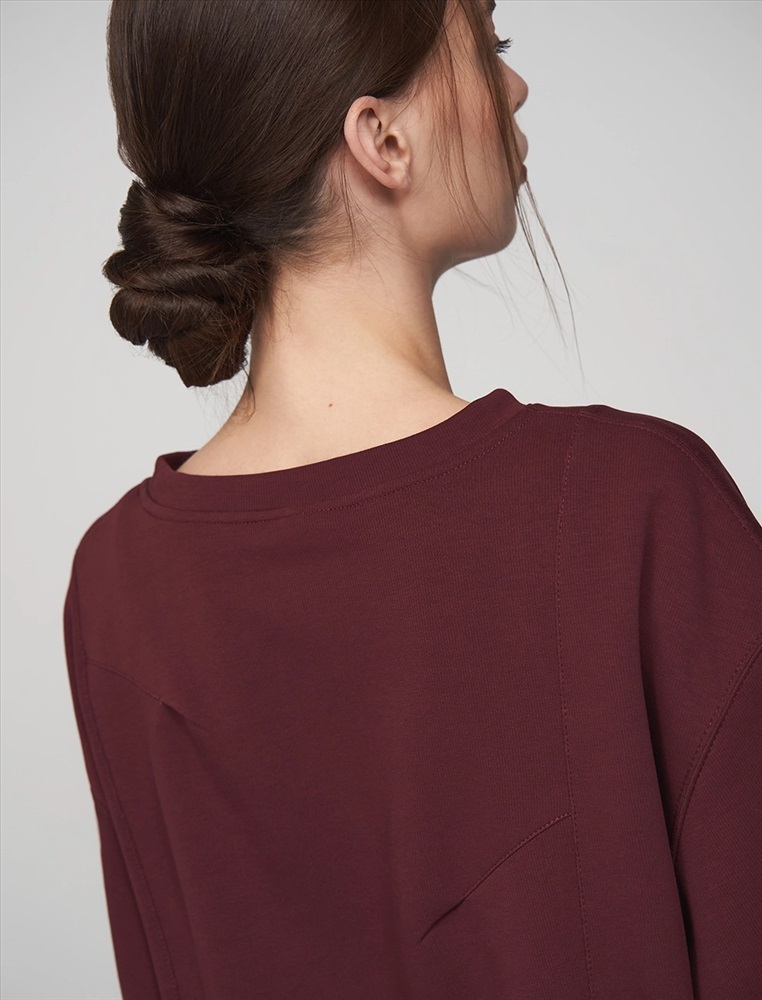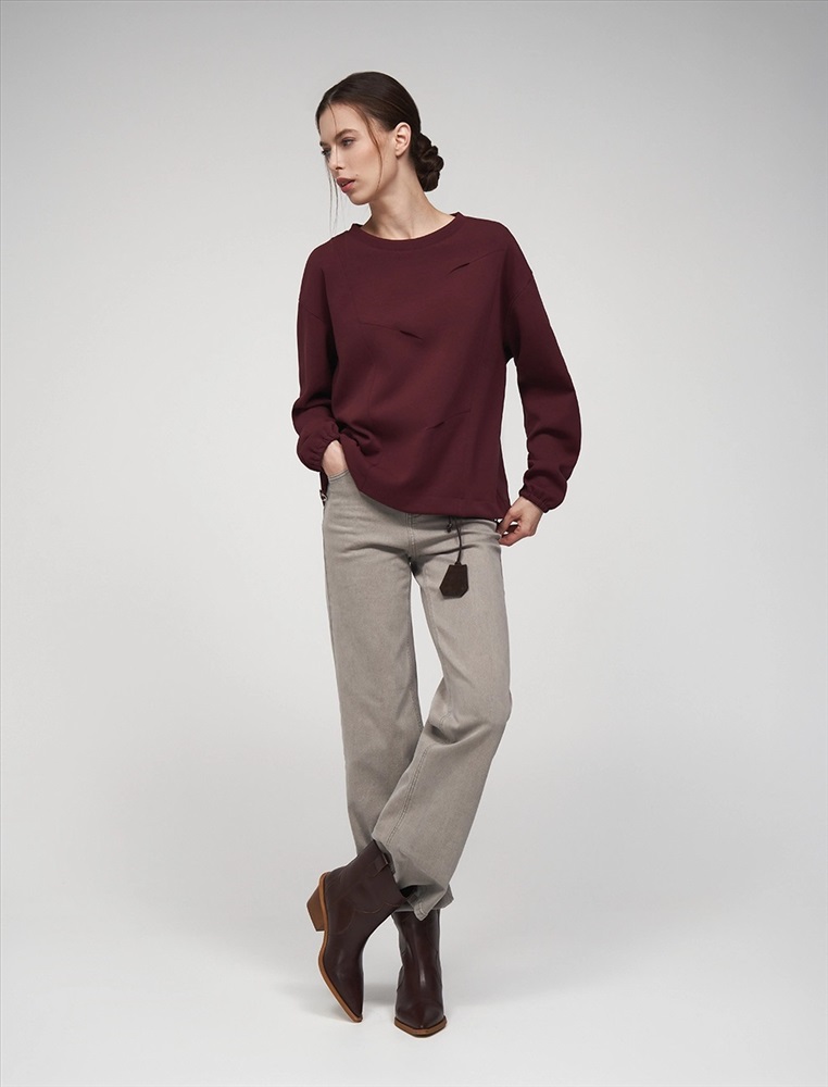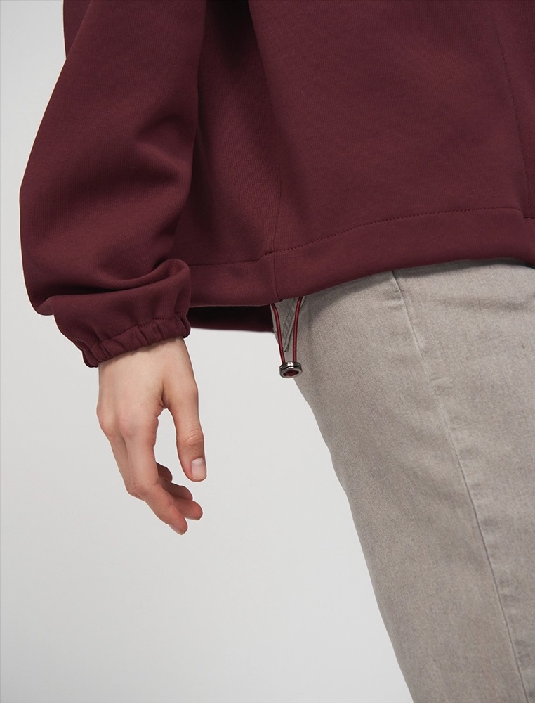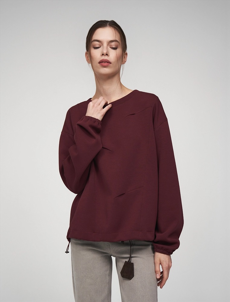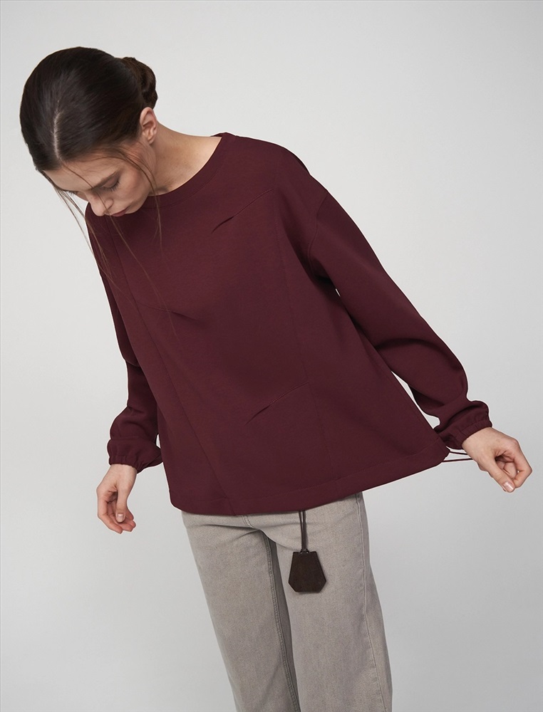 Видео: https-//hassfashion.ru/upload/iblock/46b/pgbfurzyqf6g24fepe6ilsig3q0g6cqd.mp4 осень-зима 85% Хлопок, 10% Полиэстер, 5% Спандекс Свитшот регулярного силуэта со спущенной линией плеча. Горловина по типу R-neck. По низу рукавов — эластичная резинка. По низу изделия — эластичный шнурок с фиксатором для затягивания. По передней и задней части изделия — вертикальные резы с тремя перпендикулярными застроченными на треть складками. Выполнен из хлопка (85%) с добавлением полиэстера и спандекса, что обеспечивает комфорт и долговечность. Представлен в бордовом оттенке.
