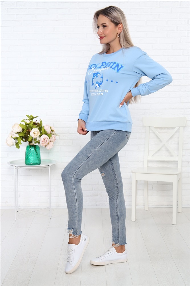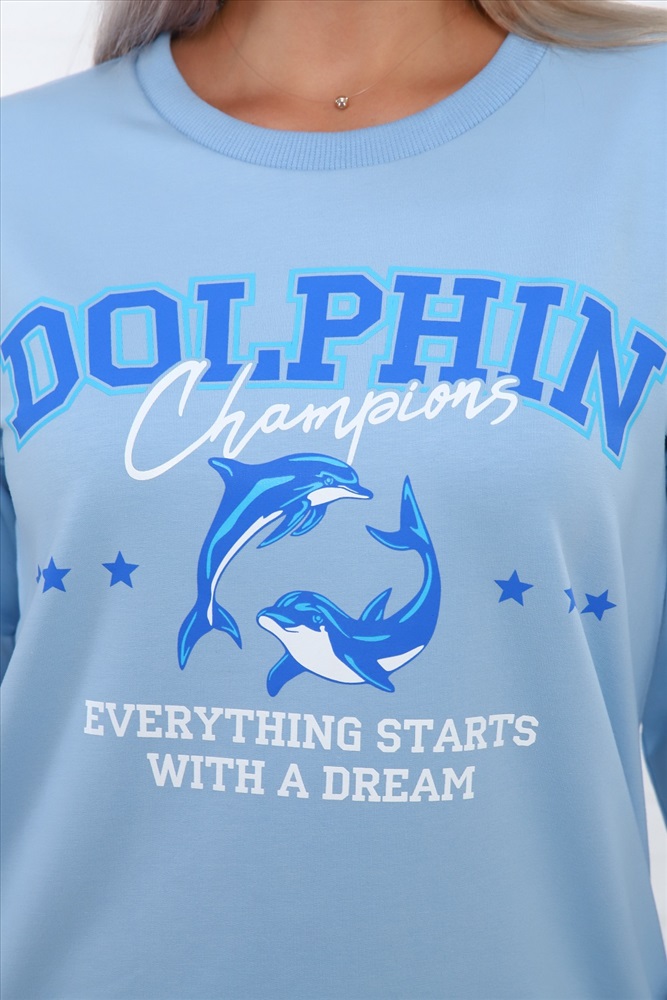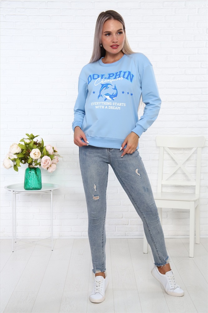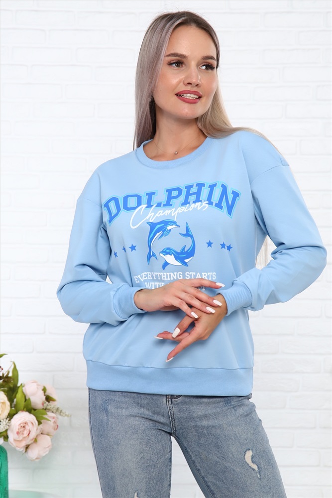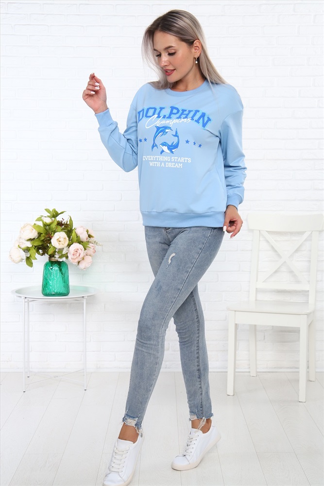 Застежка: без застежки Свитшот Дельфин из футера, со стильным принтом на груди, низ на поясе - кашкорсе. Рукава длинные, с манжетом - кашкорсе.
