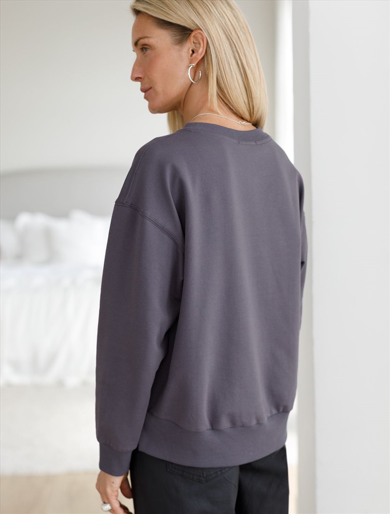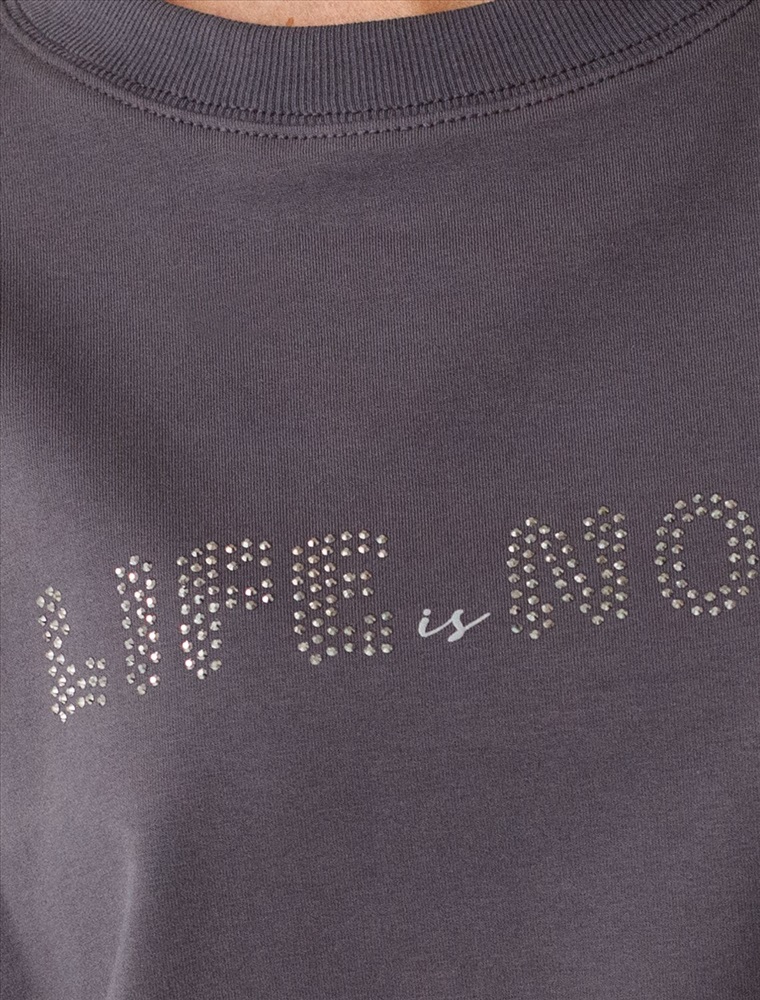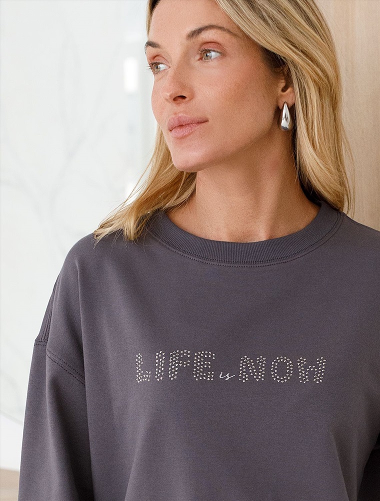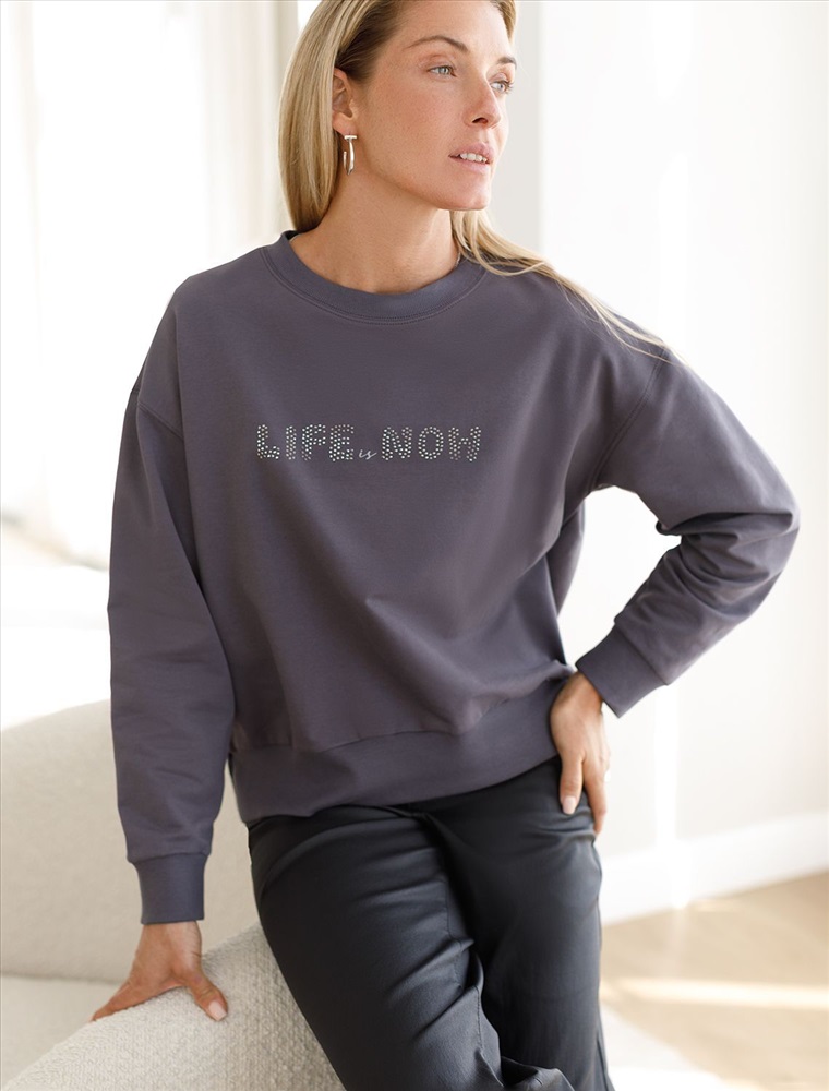 Свитшот выполнен из эластичного футера двухнитки. Изделие дополнили аппликацией из металлических страз. Перевод: Life is now - живи сейчас. Расслабленный стиль поддерживает спущенная линия плеча, свободный силуэт и разрезы по бокам. Модель сочетается в костюме с брюками D44.135, D44.136, D44.137 и юбкой D46.034