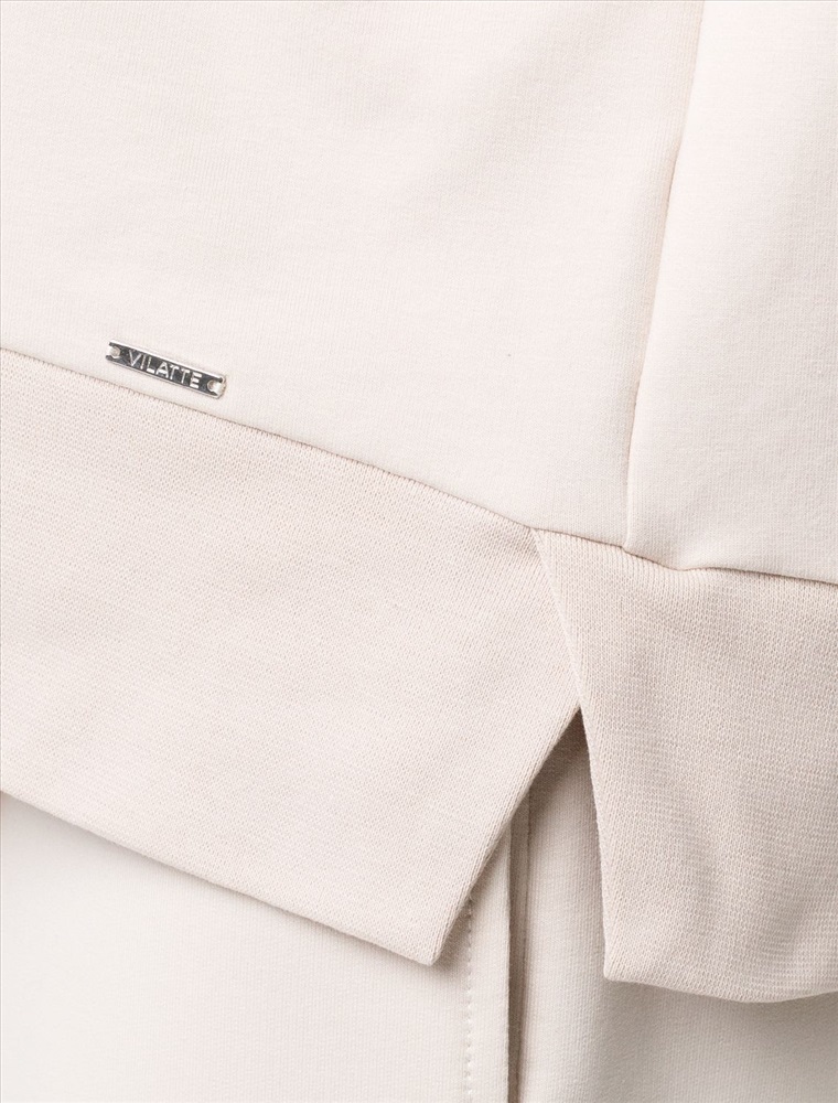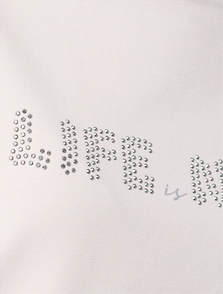 Свитшот выполнен из эластичного футера двухнитки. Изделие дополнили аппликацией из металлических страз. Перевод: Life is now - живи сейчас. Расслабленный стиль поддерживает спущенная линия плеча, свободный силуэт и разрезы по бокам.
