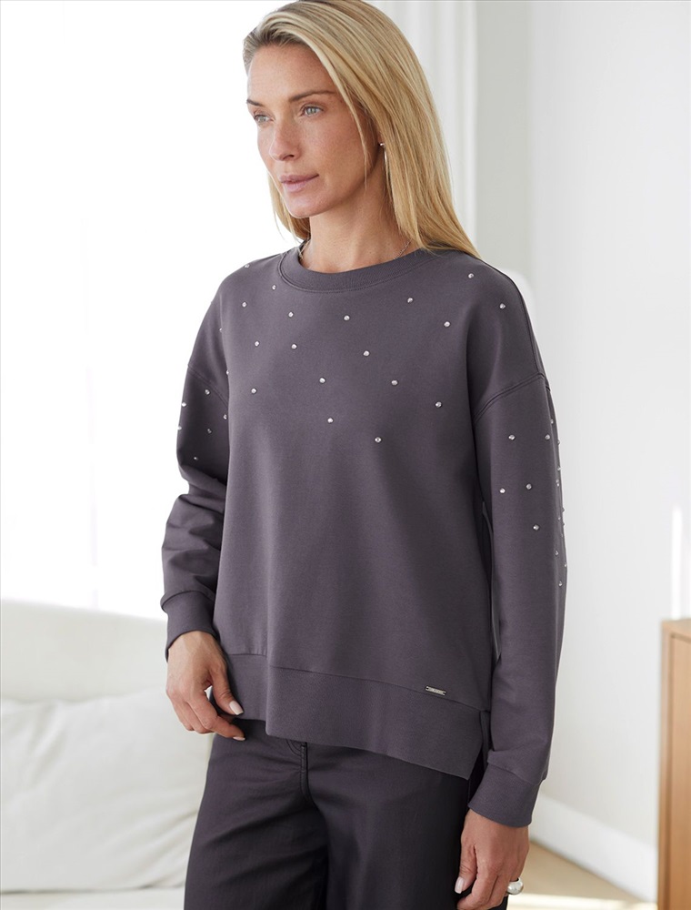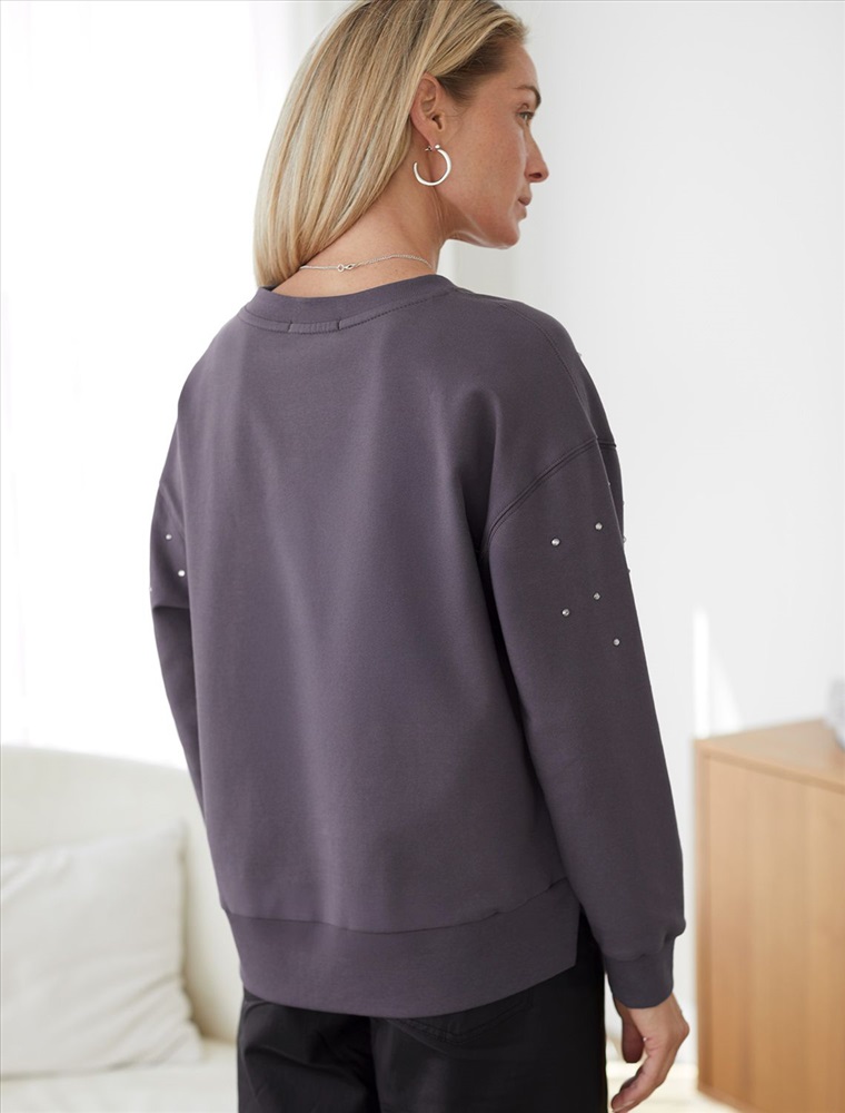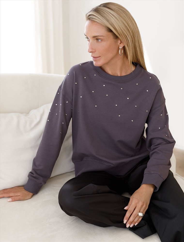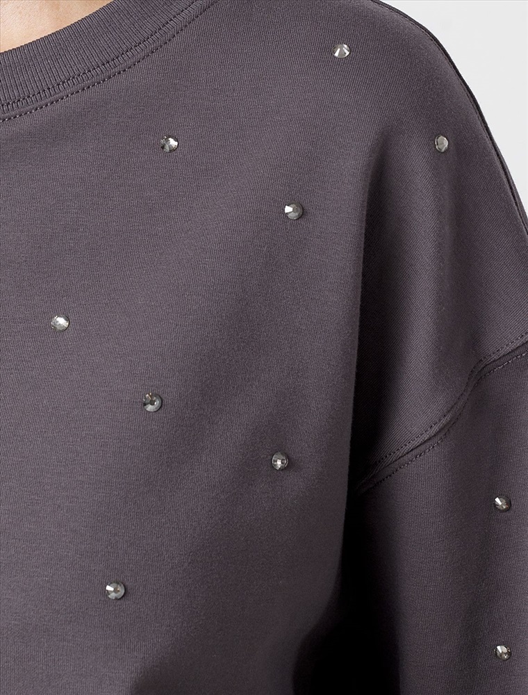 Плотность: 260 Г/м2 Параметры модели на первом фото: Рост 170, бюст 89, талия 63, бедра 92 Свитшот выполнен из эластичного футера двухнитки. Изделие дополнили лаконичным принтом стразами в тон изделия. Расслабленный стиль поддерживает спущенная линия плеча, свободный силуэт и разрезы по бокам. Модель сочетается в костюме с брюками D44.135, D44.136, D44.137 и юбкой D46.034 Комментарии к товару