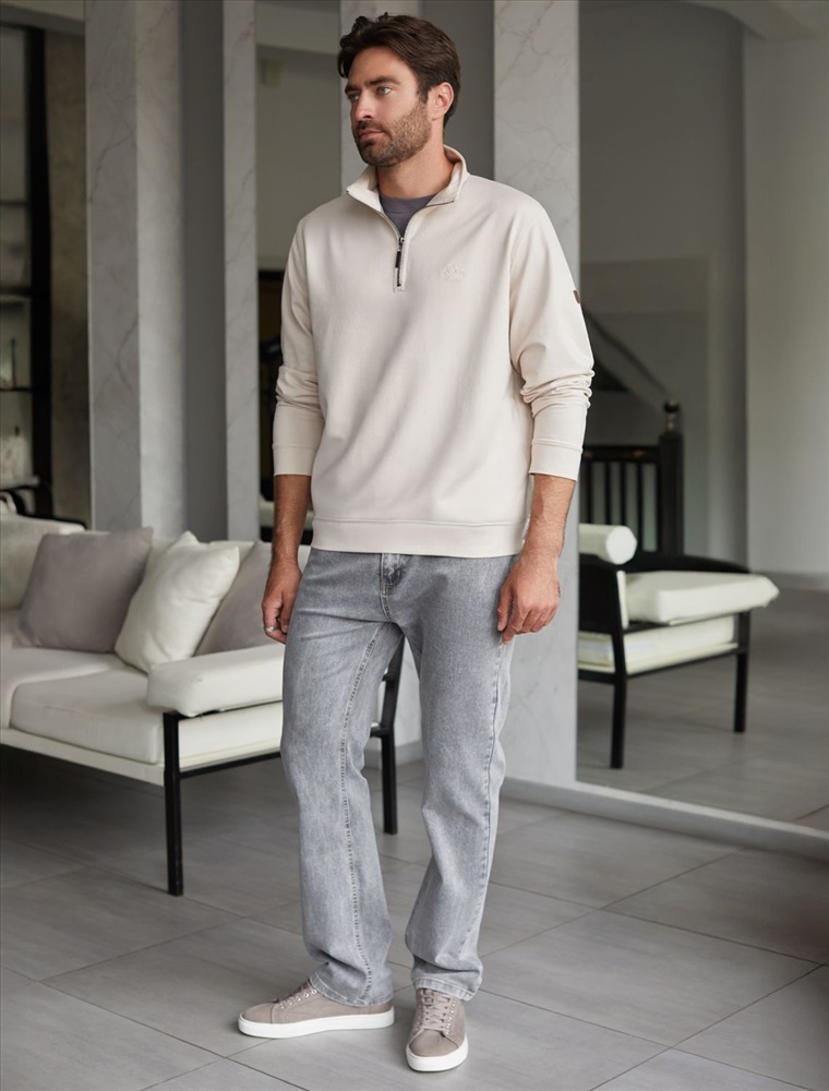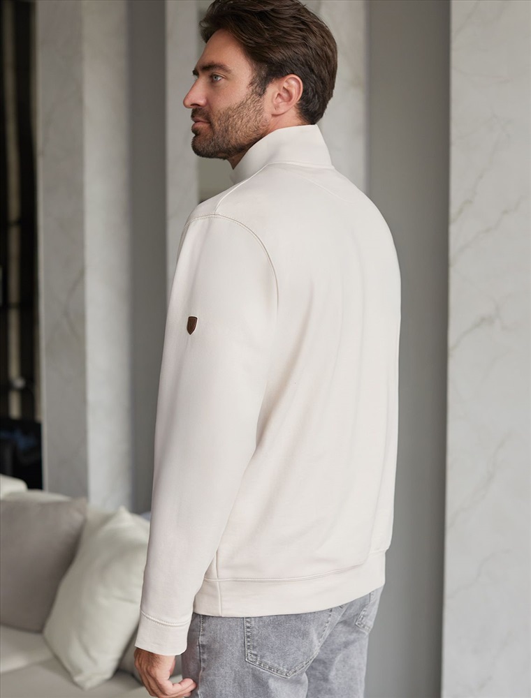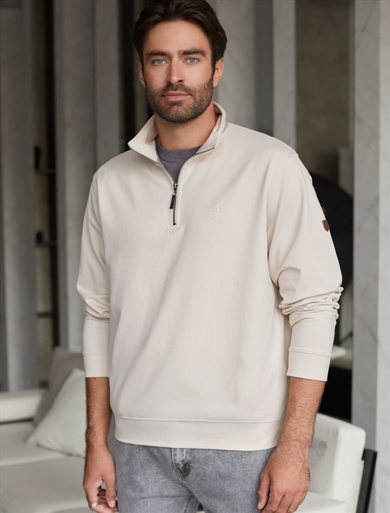Уютный и стильный свитшот светло-бежевого цвета с воротом-стойкой на молнии - идеальный выбор для повседневного образа. Выполнен из премиального футера двухнитки с эластаном, Изнаночная сторона невероятно мягкая, что делает материал особенно приятным к телу. Благодаря эластичной структуре ткань хорошо тянется, сохраняет форму после длительной носки и обеспечивает свободу движений даже в самых активных буднях, а натуральный состав обеспечивает отличную воздухопррницаемость, позволяя коже дышать и не перегреваться.
