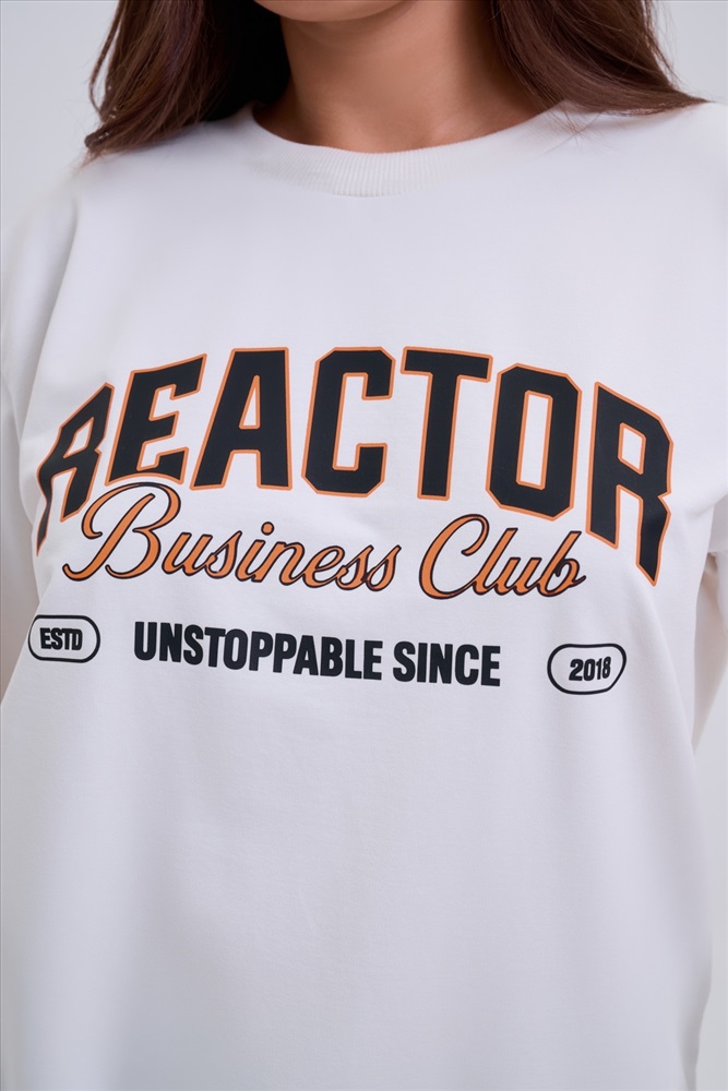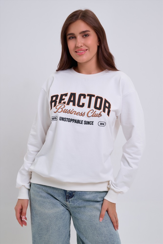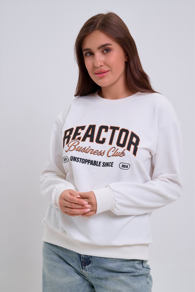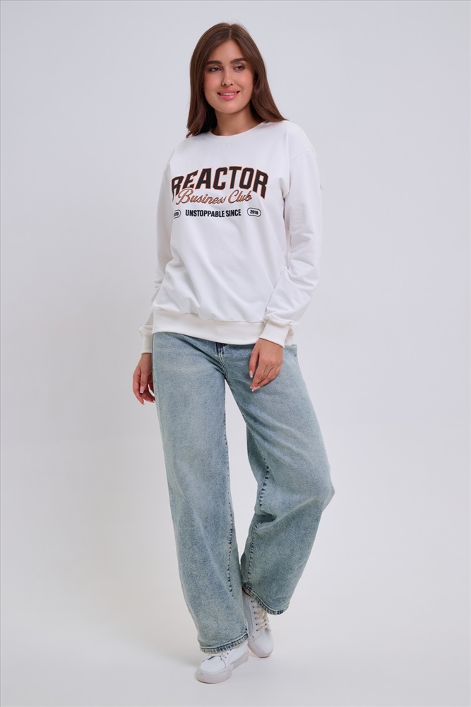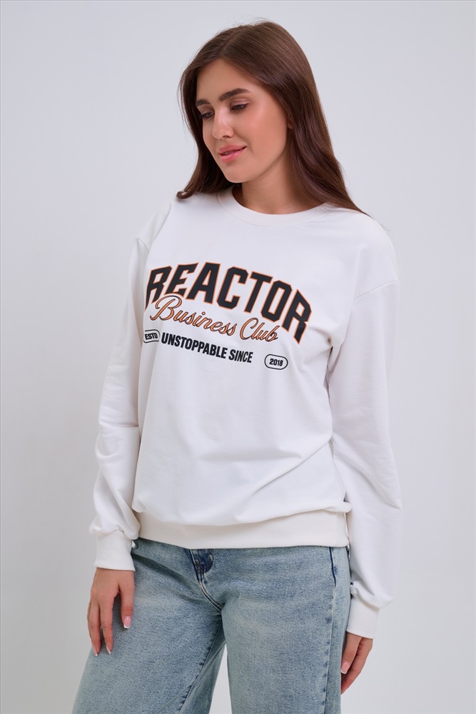 Застежка: без застежки Женский свитшот свободного прямого кроя с круглой горловиной и слегка приспущенными плечами. Спереди нанесён принт в виде надписи REACTOR. Выполнен из мягкого и приятного материала футера 2-х нитки, обеспечивающего дополнительный комфорт и сохранение тепла даже в холодную погоду. Доступен в сдвоенных размерах, что удобно для подбора идеальной посадки. Подходит как для повседневной носки, так и для создания эффектных образов в любом стиле.