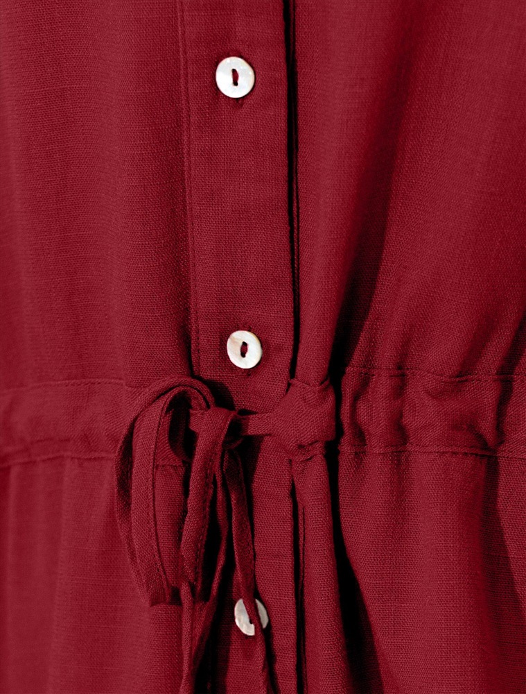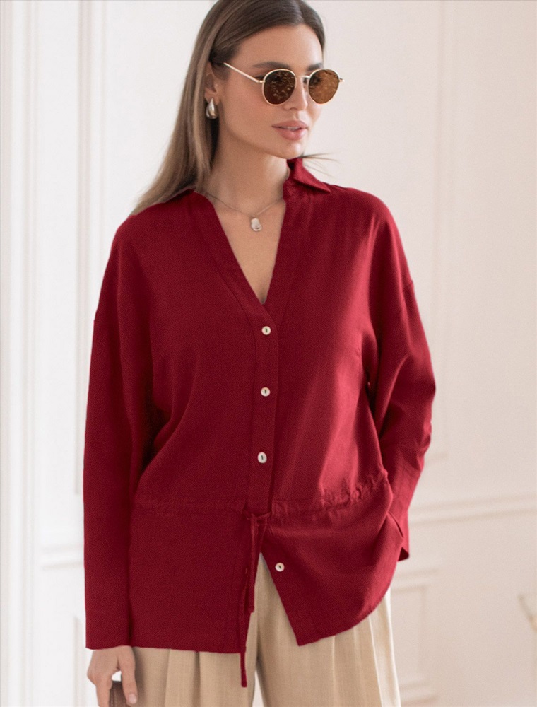 Свободная блузка гранатового цвета с кулиской на талии изо льна с вискозой, плотностью 200 Г/м2 - идеальный вариант для весны и лета. Сочетание льна и вискозы обеспечивает комфорт и прохладу в жаркие дни. Материал хорошо драпируется и мягко прилегает к фигуре, создавая струящиеся складки. Эта эффектная блузка сочетает в себе современный крой, удобство и стиль. Отложной воротник придает образу элегантность, спущенная линия плеча — модный и расслабленный акцент, а широкий рукав создает красивый и воздушный силуэт. Талия оформлена утягивающей кулиской, что позволяет регулировать посадку — создайте акцент на поясе для женственного силуэта или носите свободно для комфорта, отлично скроет возможные недостатки. Пуговицы по всей длине делают льняную рубашку особенно практичной, вы можете носить ее растегнутой, как верхний слой. Эта легкая блузка подходит для повседневного гардероба, смотрится красиво и стильно, обеспечивая максимальное удобство, подойдет и на большие размеры.