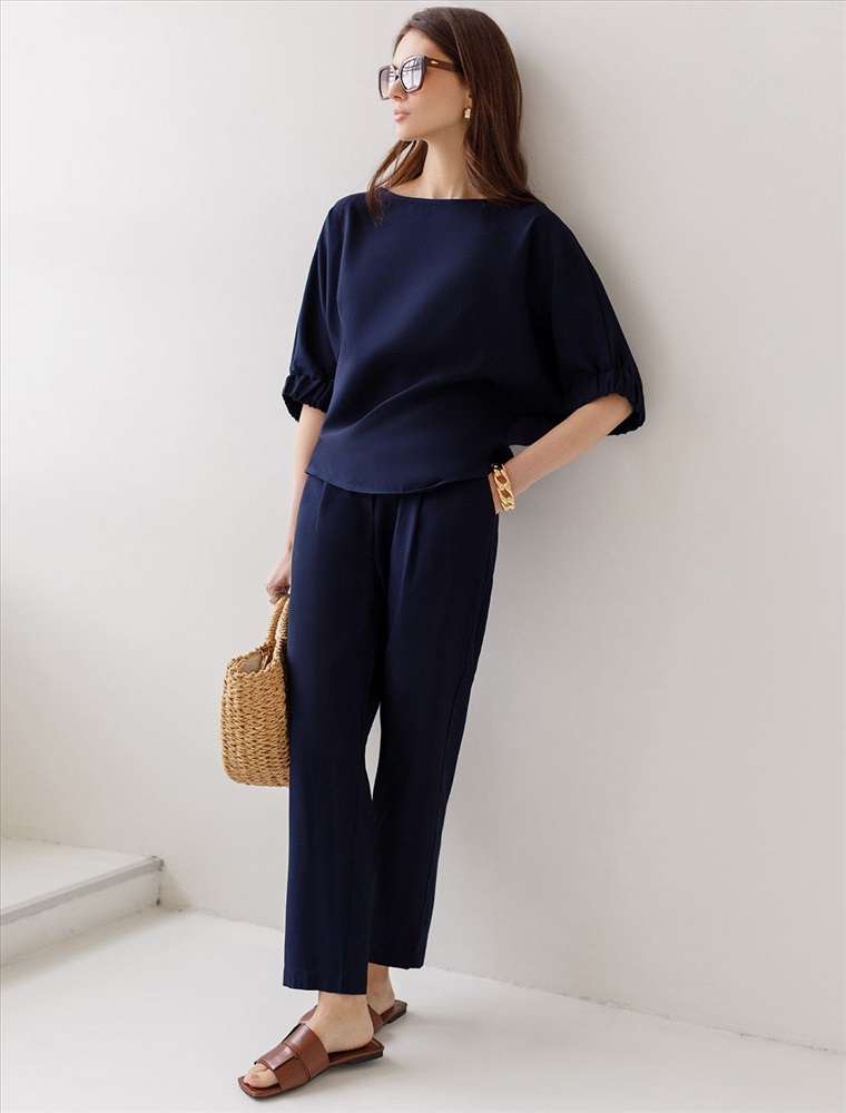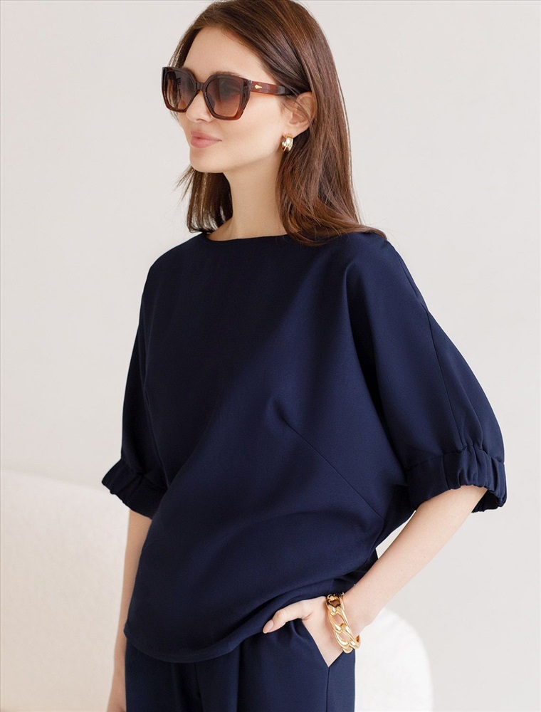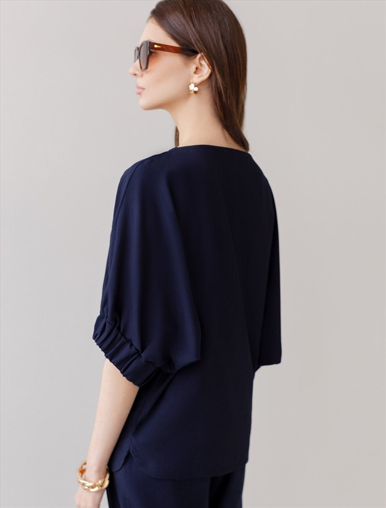 Плотность: 180 Г/м2 Свободная блузка темно-синего цвета выполнена из плотного лиоцелла. Лиоцелл это более дорогой и экологичный вариант вискозы, очень прочный и шелковистый. Современная интерпретация кроя «летучая мышь» дополнена акцентными эластичными манжетами. Эта блузка идеальна для любого типа фигуры, в том числе и на королевские размеры. Этот крой создан для того, чтобы мягко скрыть лишние объемы. Эта повседневная блузка с вырезом лодочка создана для легкого и утонченного стиля. Мягкие линии кроя создают невероятно эффектный образ, который подчеркивает естественную красоту, не стесняя движений, а свободный фасон дарит ощущение абсолютного комфорта и уверенности. Блузка красиво драпируется при движении, создавая летящий, воздушный эффект. Реомендуем сочетать с артикулами: D24.310, D24.311, D26.203