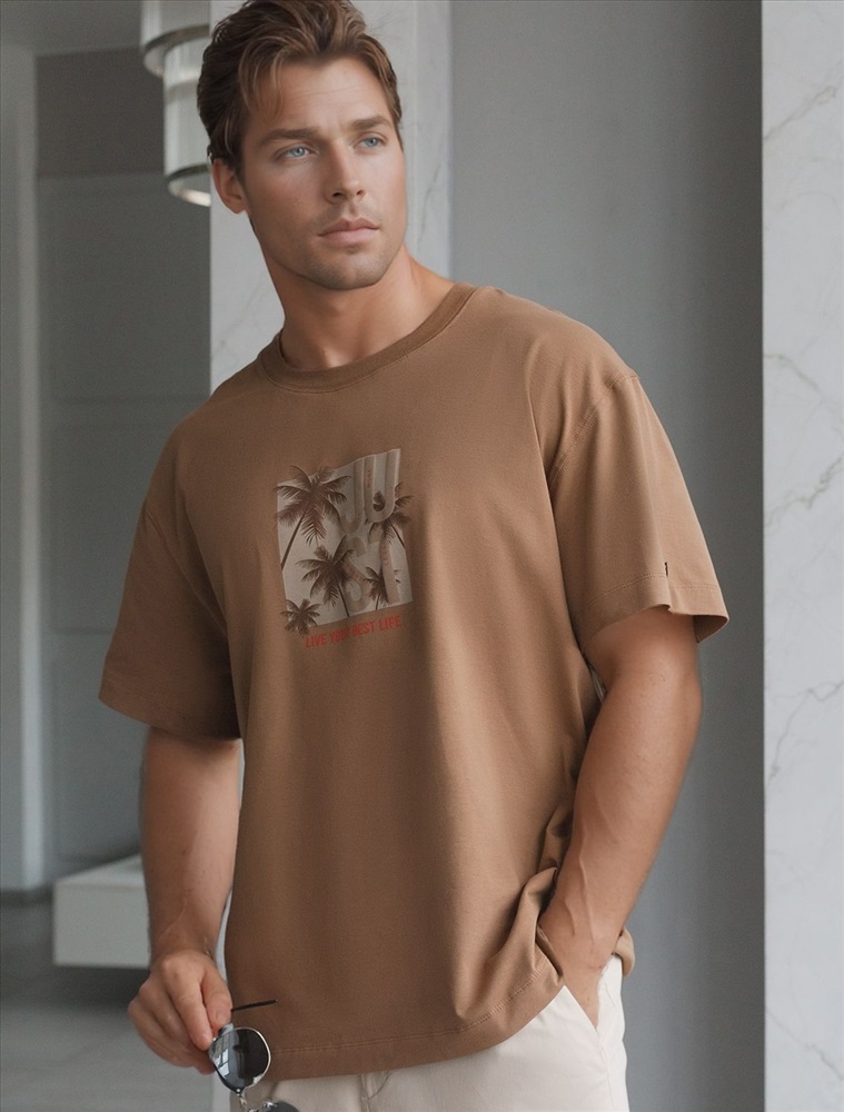 Перевод принта: Live your best live - живи свою лучшую жизнь. Футболка свободного кроя выполнена из премиального хлопка. Авторский принт нанесен красками с устойчивым покрытием. Благодаря эластану, носить изделие очень комфортно, и оно сохранит свой безупречный вид в течение долгого времени. На рукаве нашивка из эко-кожи с логотипом бренда.