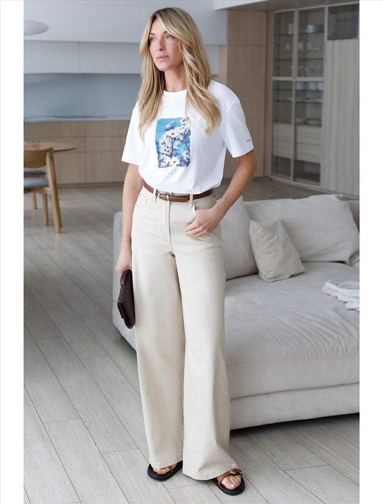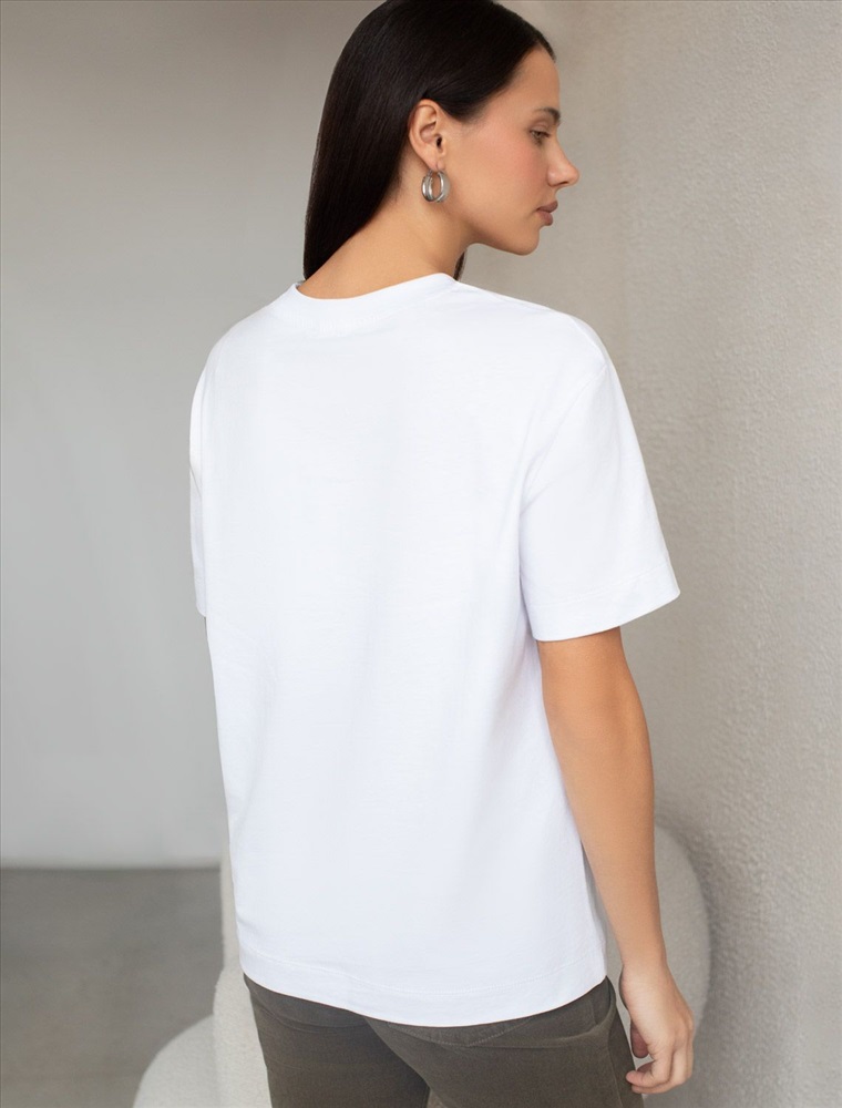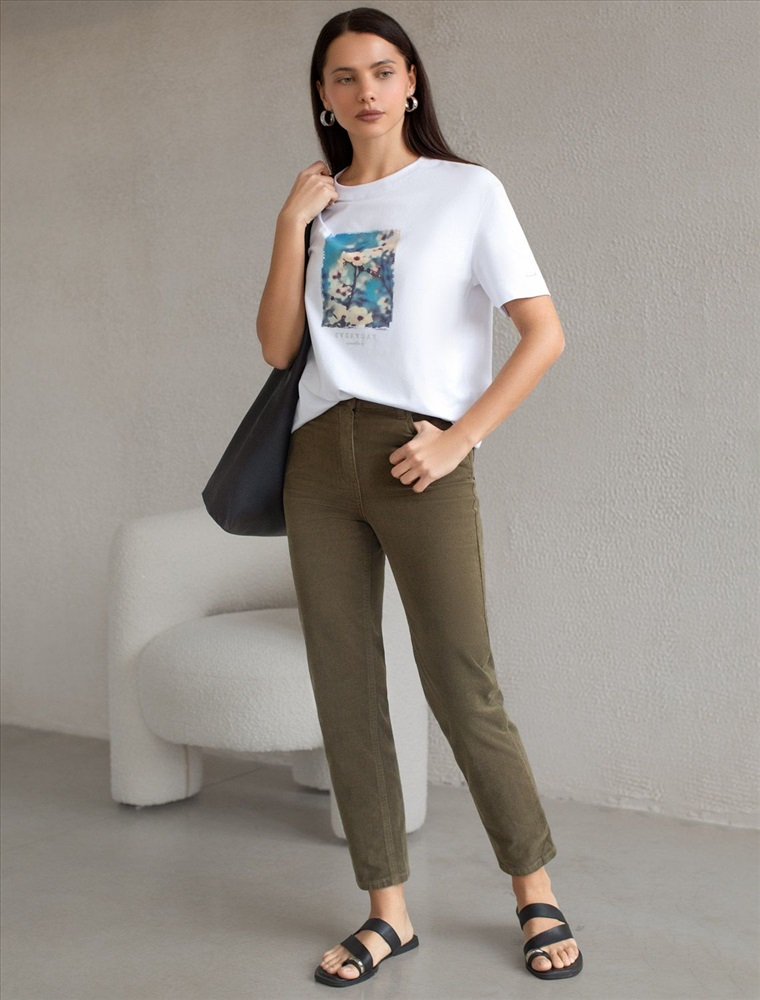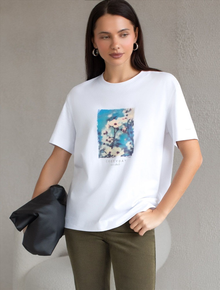 Плотность: 170 Г/м2 Модная футболка белого цвета привлекает внимание своим интересным дизайном и ярким принтом. Благодаря прямому крою изделие комфортно садится на любую фигуру, в том числе на большие размеры, и не сковывает движений. Круглый вырез подчеркивает современный стиль, а натуральный материал из хлопка с добавлением эластана обеспечивает удобство в повседневной носке и приятные тактильные ощущения. Прочность и износостойкая структура позволяют сохранять свежий внешний вид после множества стирок. Принт в виде цветов и надписи нанесен красками с устойчивым покрытием, перевод надписи: Everyday essentials - Повседневные вещи, которые необходимы. Стильная футболка гармонично вписывается в любой гардероб и подойдет для прогулок, отдыха или неформальных встреч. Благодаря особенностям кроя модель хорошо сидит, скрывая недостатки и подчеркивая достоинства. Яркая футболка идеально сочетается с базовыми вещами, позволяя создавать новые интересные образы каждый день. Комментарии к товару
