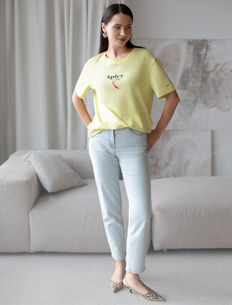 Плотность: 170 Г/м2 Модная футболка лимонного цвета привлекает внимание своим интересным дизайном и ярким принтом. Благодаря прямому крою изделие комфортно садится на любую фигуру, в том числе на большие размеры, и не сковывает движений. Круглый вырез подчеркивает современный стиль, а натуральный материал плотностью 170 Г/м2 из хлопка с добавлением эластана обеспечивает удобство в повседневной носке и приятные тактильные ощущения. Прочность и износостойкая структура позволяют сохранять свежий внешний вид после множества стирок. Принт в виде перчика и надписи нанесен красками с устойчивым покрытием, перевод надписи: Spice club - Клуб специй. Стильная футболка гармонично вписывается в любой гардероб и подойдет для прогулок, отдыха или неформальных встреч. Благодаря особенностям кроя модель хорошо сидит, скрывая недостатки и подчеркивая достоинства. Яркая футболка идеально сочетается с базовыми вещами, позволяя создавать новые интересные образы каждый день. Комментарии к товару