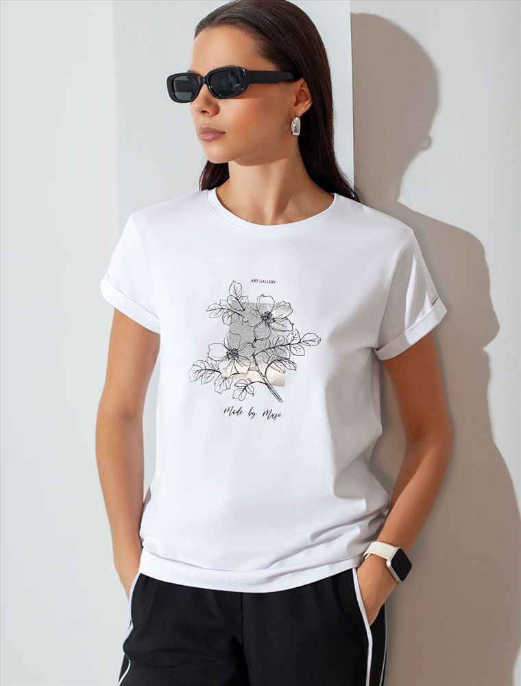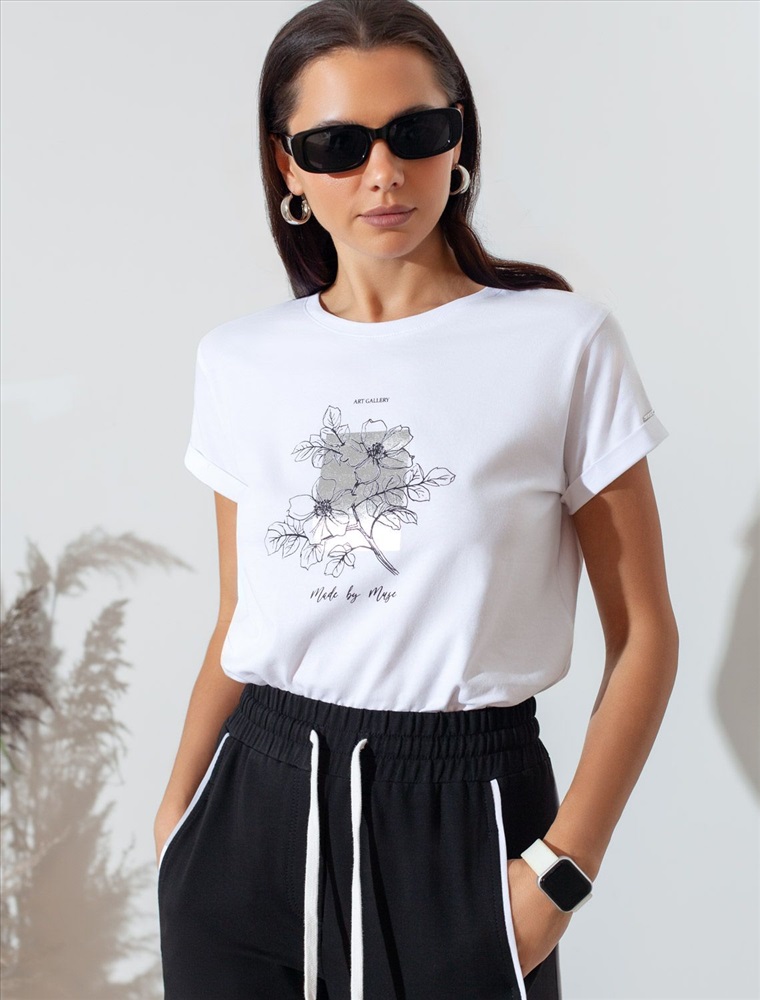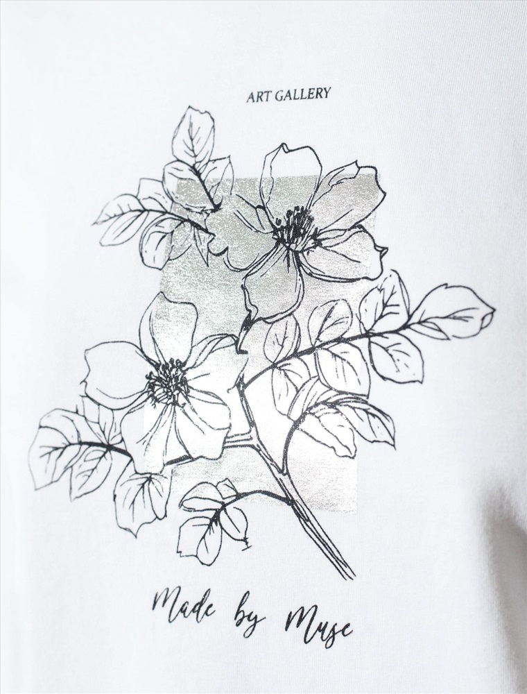 Плотность: 170 Г/м2 Модная футболка белого цвета привлекает внимание своим интересным дизайном и ярким принтом. Благодаря прямому крою изделие комфортно садится на любую фигуру, в том числе на большие размеры, и не сковывает движений. Круглый вырез подчеркивает современный стиль, а натуральный материал из хлопка с добавлением эластана обеспечивает удобство в повседневной носке и приятные тактильные ощущения. Прочность и износостойкая структура сохраняет первоначальную форму футболки после множества стирок. Рукава имеют аккуратные подгибы, что придает изделию завершенность и помогает сохранять аккуратный внешний вид. Принт в виде цветов и надписи нанесен красками с устойчивым покрытием, перевод надписи: Art gallery made by muse - Художественная галерея, созданная музой. Стильная футболка гармонично вписывается в любой гардероб и подойдет для прогулок, отдыха дома или неформальных встреч. Благодаря особенностям кроя модель хорошо сидит, скрывая недостатки и подчеркивая достоинства. Удобная футболка идеально сочетается с базовыми вещами, позволяя создавать новые интересные образы каждый день. Комментарии к товару
