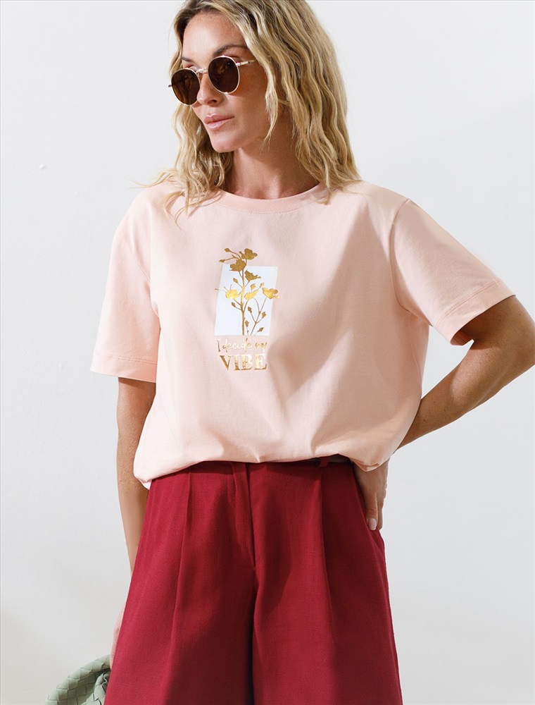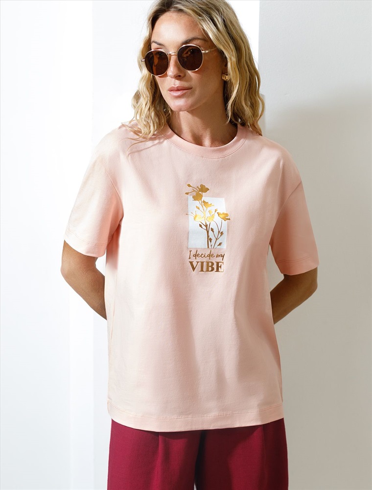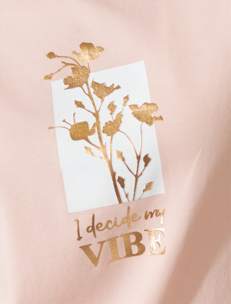Плотность: 170 Г/м2 Модная футболка пудрового цвета привлекает внимание своим интересным дизайном и ярким принтом. Благодаря прямому крою изделие комфортно садится на любую фигуру, в том числе на большие размеры, и не сковывает движений. Круглый вырез подчеркивает современный стиль, а натуральный материал плотностью 170 Г/м2 из хлопка с добавлением эластана обеспечивает удобство в повседневной носке и приятные тактильные ощущения. Прочность и износостойкая структура позволяют сохранять свежий внешний вид после множества стирок. Принт в виде цветов и надписи нанесен красками с устойчивым покрытием, перевод надписи: I decide my vibe - Я определяю свое настроение.Стильная футболка гармонично вписывается в любой гардероб и подойдет для прогулок, отдыха или неформальных встреч. Благодаря особенностям кроя модель хорошо сидит, скрывая недостатки и подчеркивая достоинства. Яркая футболка идеально сочетается с базовыми вещами, позволяя создавать новые интересные образы каждый день. Комментарии к товару