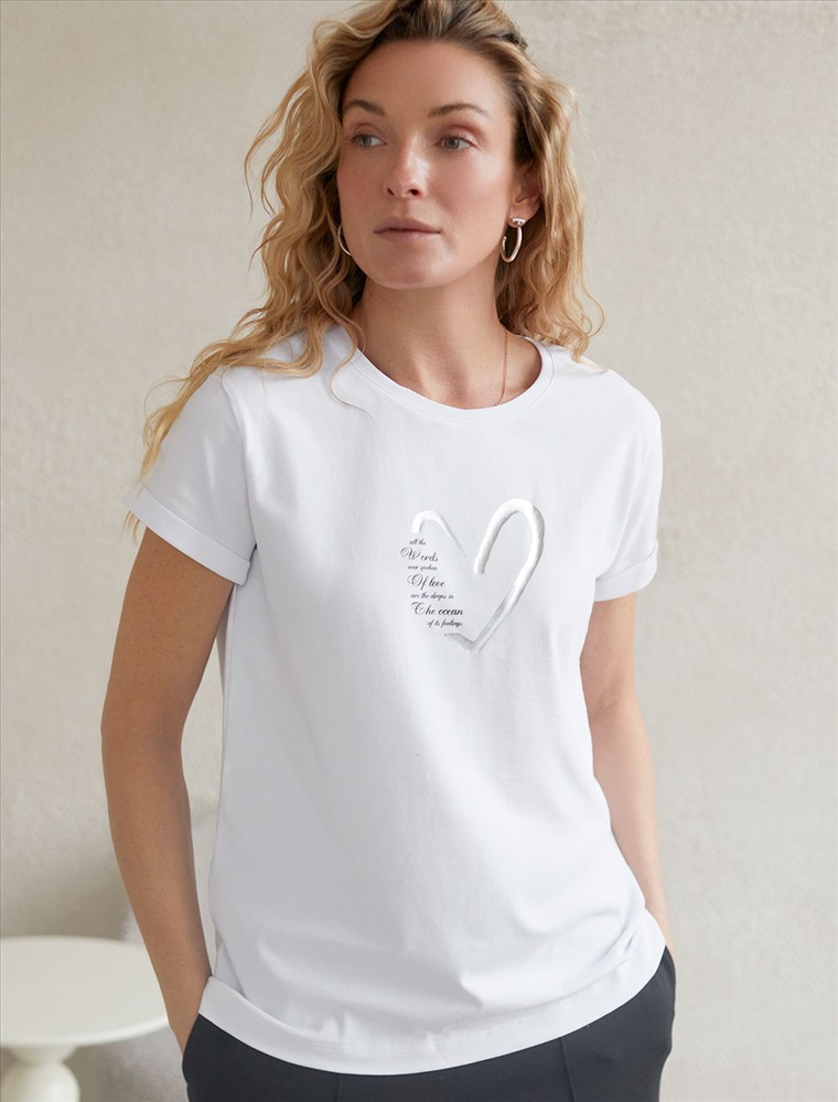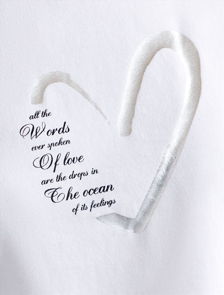 Плотность: 170 Г/м2 Модная футболка белого цвета привлекает внимание своим интересным дизайном и ярким принтом. Благодаря прямому крою изделие комфортно садится на любую фигуру, в том числе на большие размеры, и не сковывает движений. Круглый вырез подчеркивает современный стиль, а натуральный материал из хлопка с добавлением эластана обеспечивает удобство в повседневной носке и приятные тактильные ощущения. Прочность и износостойкая структура сохраняет первоначальную форму футболки после множества стирок. Рукава имеют аккуратные подгибы, что придает изделию завершенность и помогает сохранять аккуратный внешний вид. Принт в виде сердца и надписи нанесен красками с устойчивым покрытием, перевод надписи: All the word even spoken of love are the drops in the ocean ol its feeling - Все слова, даже произнесенные о любви, — это капли в океане ее чувств. Стильная футболка гармонично вписывается в любой гардероб и подойдет для прогулок, отдыха дома или неформальных встреч. Благодаря особенностям кроя модель хорошо сидит, скрывая недостатки и подчеркивая достоинства. Удобная футболка идеально сочетается с базовыми вещами, позволяя создавать новые интересные образы каждый день.