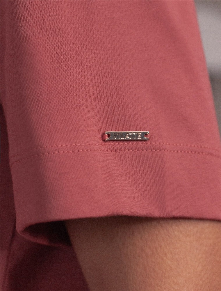 Модная футболка темно-кораллового цвета привлекает внимание своим интересным дизайном и ярким принтом. Благодаря прямому крою изделие комфортно садится на любую фигуру, в том числе на большие размеры, и не сковывает движений. Круглый вырез подчеркивает современный стиль, а натуральный материал плотностью 170 Г/м2 из хлопка с добавлением эластана обеспечивает удобство в повседневной носке и приятные тактильные ощущения. Прочность и износостойкая структура позволяют сохранять свежий внешний вид после множества стирок. Принт в виде букв логотипа бренда нанесен красками с устойчивым покрытием. Стильная футболка гармонично вписывается в любой гардероб и подойдет для прогулок, отдыха или неформальных встреч. Благодаря особенностям кроя модель хорошо сидит, скрывая недостатки и подчеркивая достоинства. Яркая футболка идеально сочетается с базовыми вещами, позволяя создавать новые интересные образы каждый день.